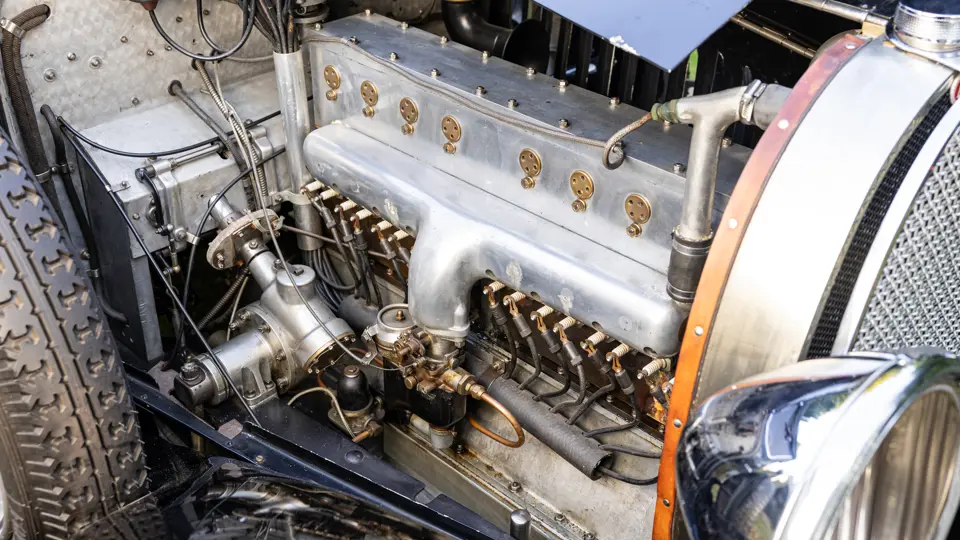 Dernière Bugatti avec un seul arbre à cames en tête entraîné par renvois coniques, boîte à cames en aluminium, 3 soupapes en tête par cylindre, 2 d’admission et 1 d’échappement.