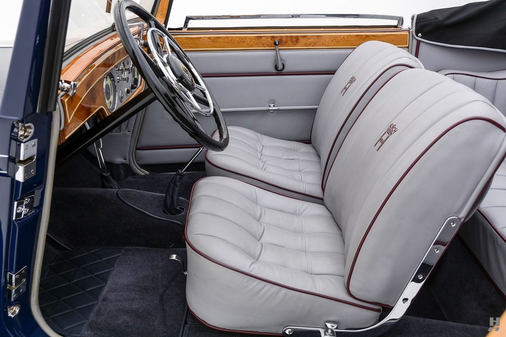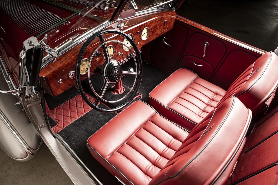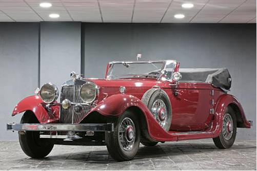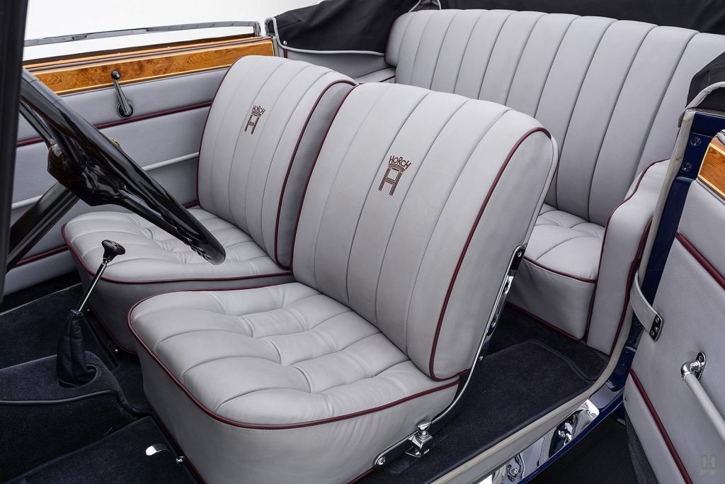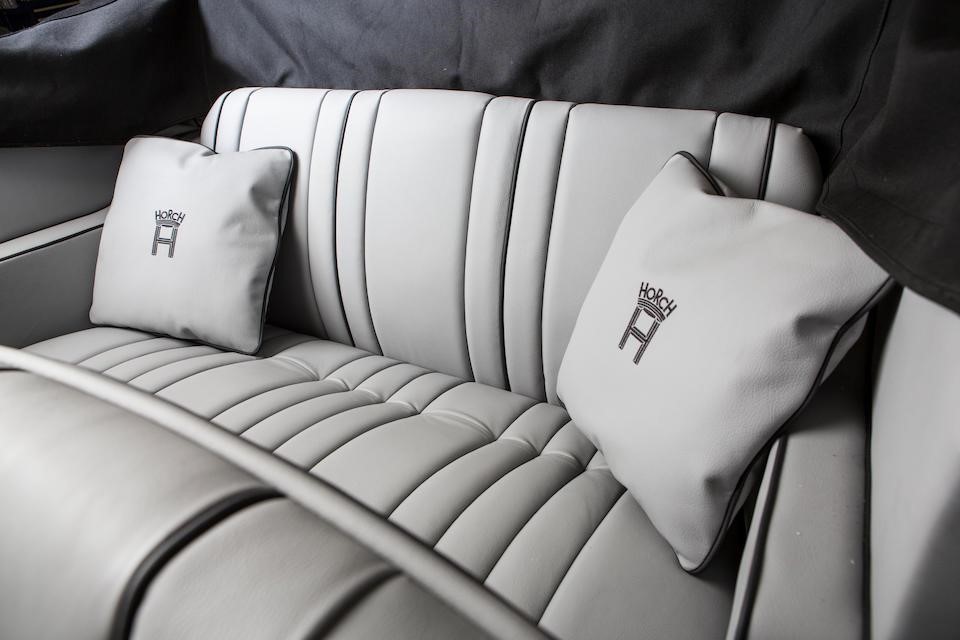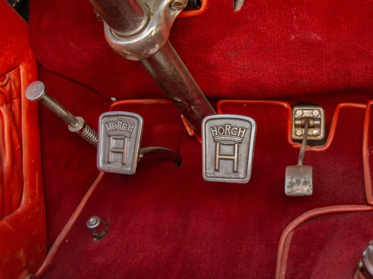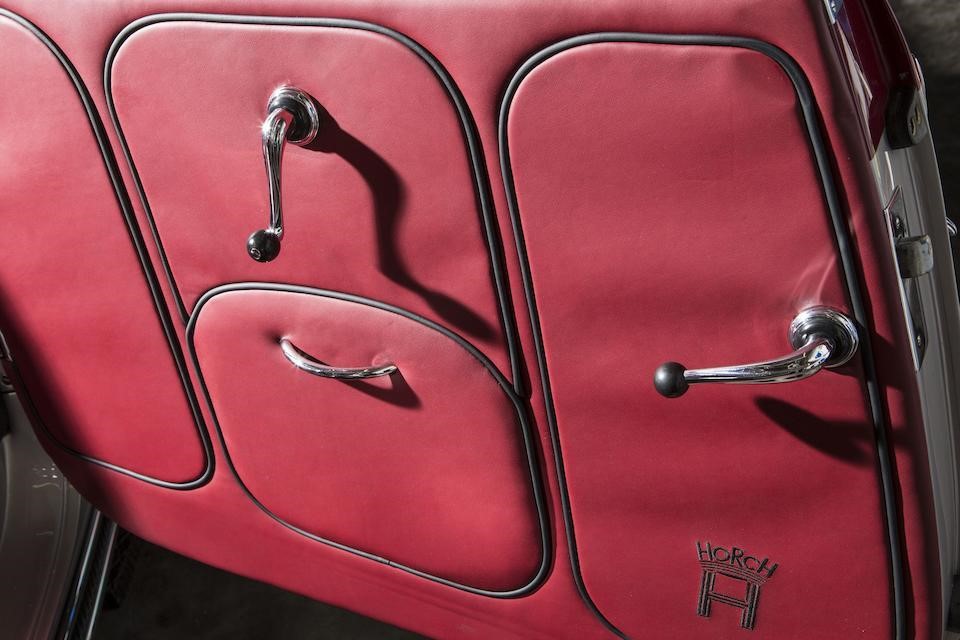 Recarrossée en Spezial Roadster dans le style Erdmann & Rossi, logos Horch brodés sur les contreportes et sièges, logos Horch et bouchon de radiateur plaqués or, Argent, capot rouge, capote doublée alcantara, cuir rouge.