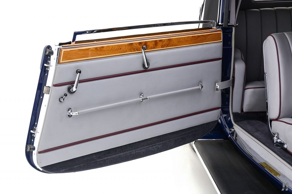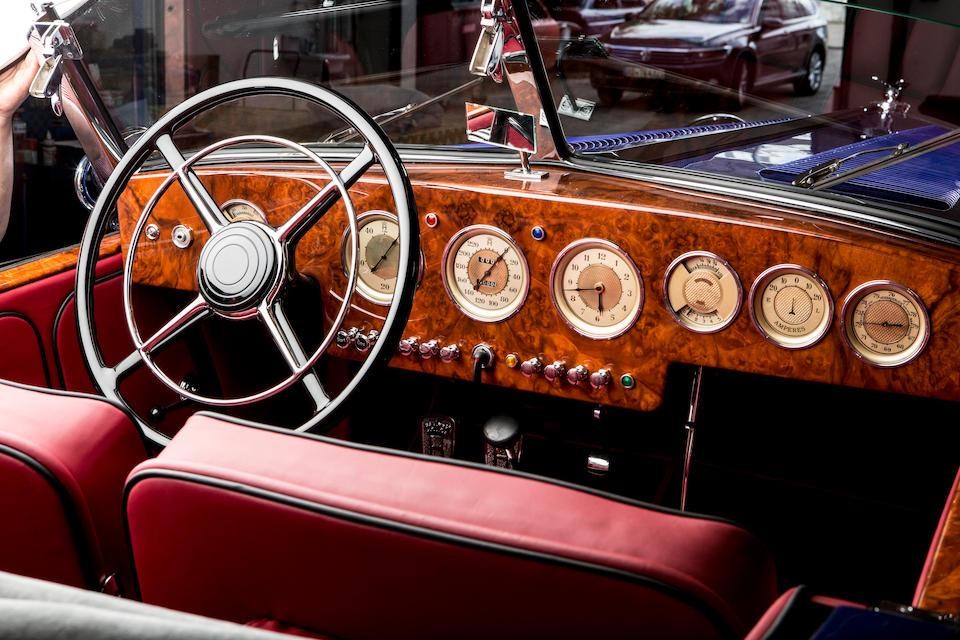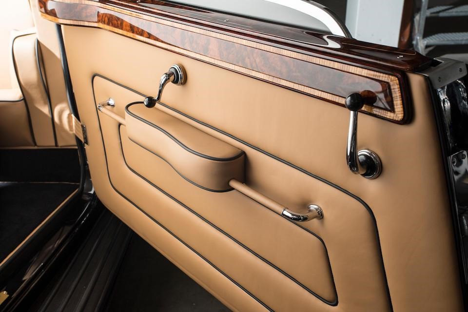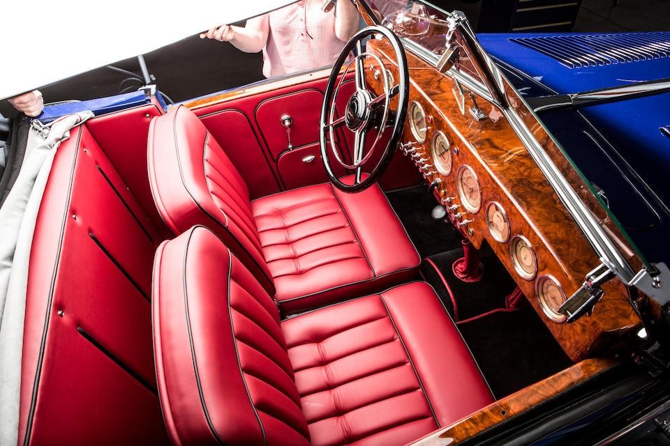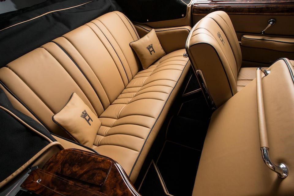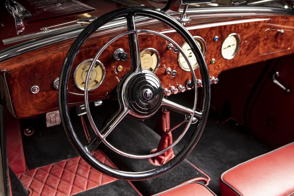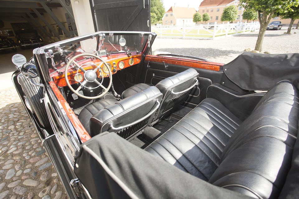 Recarrossée en Spezial Roadster dans le style Erdmann & Rossi, logos Horch brodés sur les contreportes et sièges, logos Horch et bouchon de radiateur plaqués or, Argent, capot rouge, capote doublée alcantara, cuir rouge.