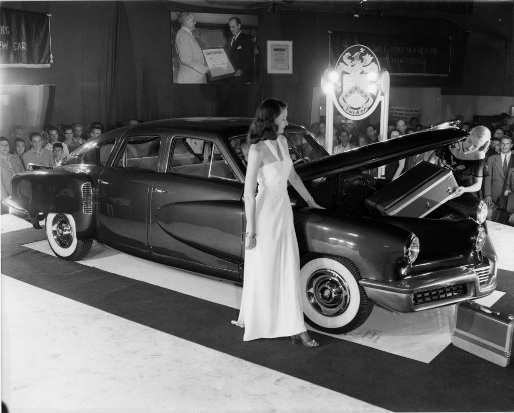 Le prototype « Tin goose » est présenté à 5000 personnes en juin 1947 à l’usine Tucker de Chicago, Ill. (USA). Les invités sont accueillis à 9 heures du matin et la voiture (rouge foncé) n’est présentée qu’à 16h30 suite à des problèmes de dernière minute : réglage des soupapes, remplacement du système d’injection par des carburateurs, changement des bras de suspensions sur les 4 roues, colmatage d’une fuite d’huile provoquant un début d’incendie, mais obtient un succès final auprès du public avant l’introduction des actions de la firme en bourse.