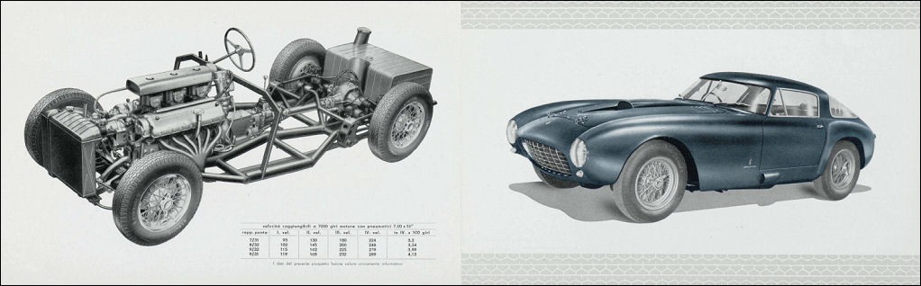 1952 : Présentation d’un coupé 342 America 4 places dessiné par Ghia : Pas de carter sec. Filtre à air et carburateurs redéployés, 200 chevaux à 5000 tours.