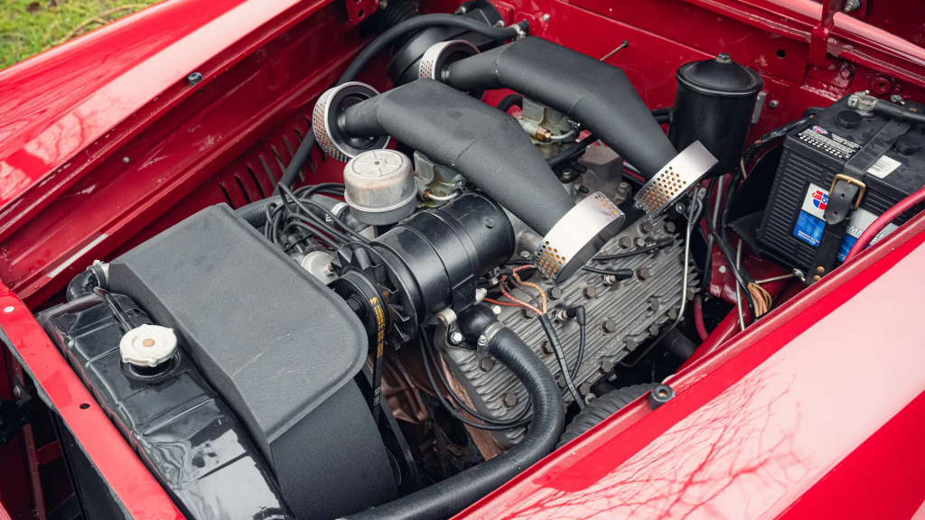 Alimentation par 2 carburateurs double corps verticaux Weber 36 DC F3 alimentés par pompe à essence mécanique à membrane.