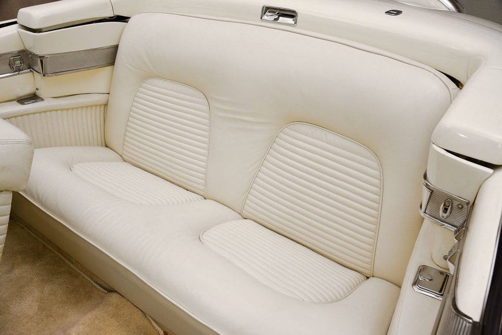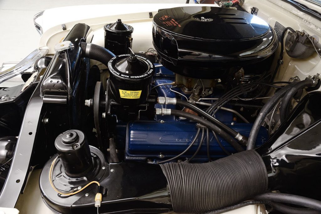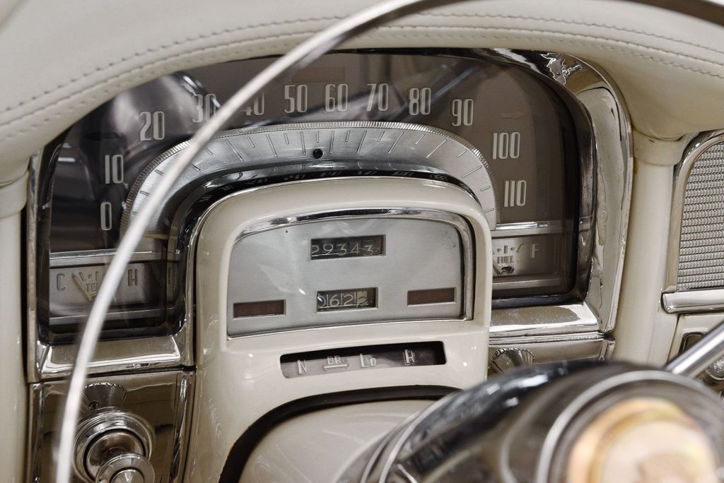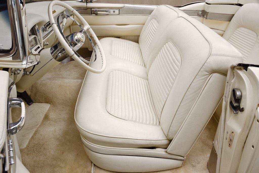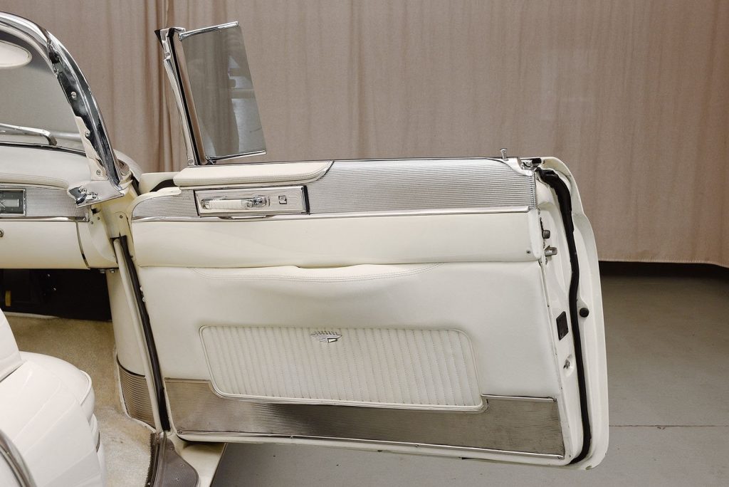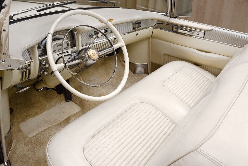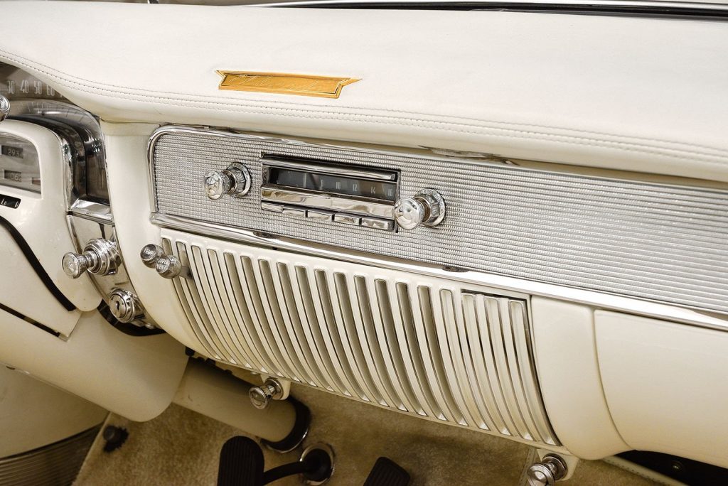L’Eldorado reprend la ligne définie en 1950 avec une ceinture de caisse haute, un capot massif et des flancs rebondis. Le profil est affiné, creusé au niveau de l’habitacle « beltline dip » pour dynamiser et surbaisser la silhouette. Pare-brise panoramique, jantes à rayons chromées en série (option sur autres modèles), couvre capote métallique assorti à la teinte de la carrosserie.