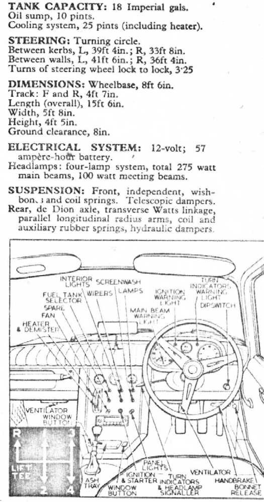 Suspension arrière par pont de Dion, timonerie de Watt, guidage assuré par 2 bras parallèles et amortissement par ressorts hélicoïdaux avec éléments auxiliaires en caoutchouc et amortisseurs hydrauliques télescopiques Armstrong Selectaride à réglage électrique montés obliquement.