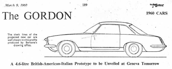 Le premier châssis est achevé en janvier 1960, puis envoyé à Turin pour montage de la carrosserie avant d’être présenté en mars au Salon de Genève sur le stand Bertone sous l’appellation Gordon GT.