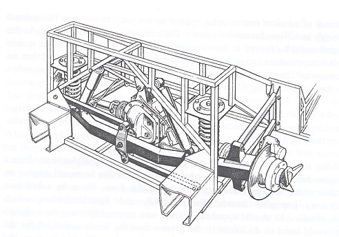 Suspension avant par roues indépendantes avec triangles superposés, ressorts hélicoïdaux et amortisseurs télescopiques Armstrong.