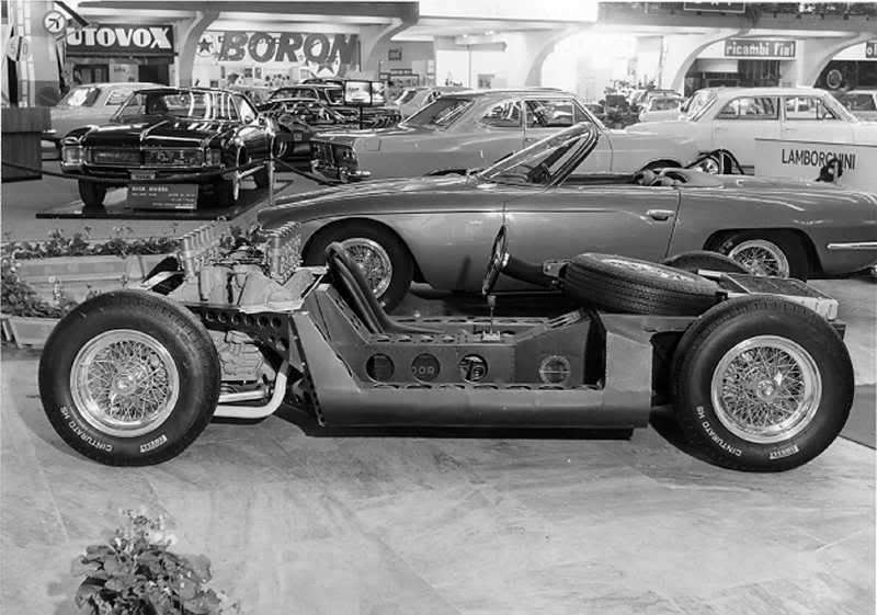 Présentation du châssis roulant au Salon de Turin (ITA) 1965 sous l’appellation P400 (Posteriore 4 litres).