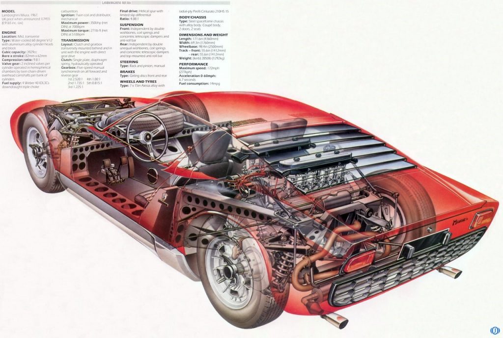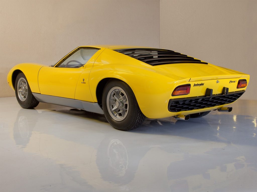 1971 : Présentation de la Miura SV au Salon de Genève. Conduits d’admission agrandis de 42 à 48mm, nouveau diagramme de distribution, 385 chevaux DIN à 7850 tours, 40,7 Mkg à 5750 tours.
