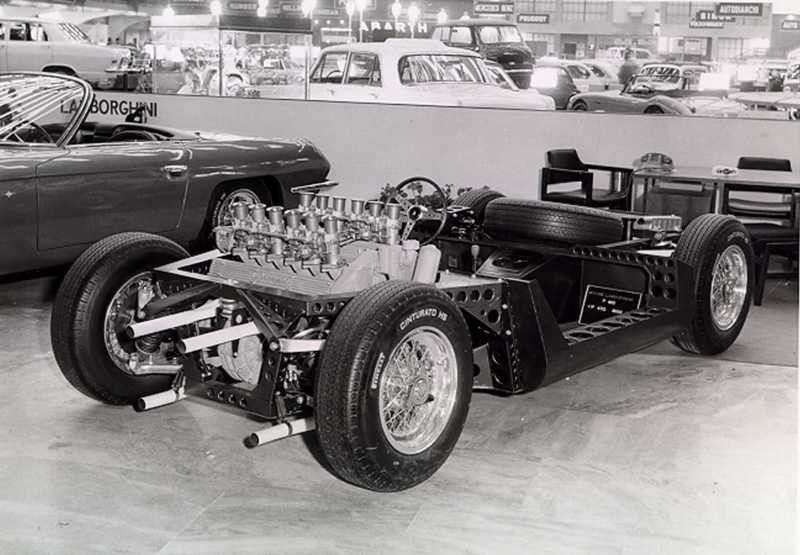 Châssis plate-forme caissonné en tôle d’acier de 9/10e d’épaisseur soudée par points. L’étude du châssis et des suspensions est faite par Gianpaolo Dallara qui définit un caisson central à deux gros longerons latéraux assemblés par le plancher et des couples faisant office de pare-feu. Une extension trapézoïdale à l’avant reçoit les suspensions et le radiateur. Le caisson central laisse passer le système électrique, les conduits d’eau, d’essence et de frein ainsi que la commande de boîte de vitesses. Il est relié aux caissons latéraux ajourés aux bords tournés vers l’intérieur (technique aviation) par un plancher plat.