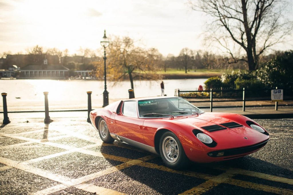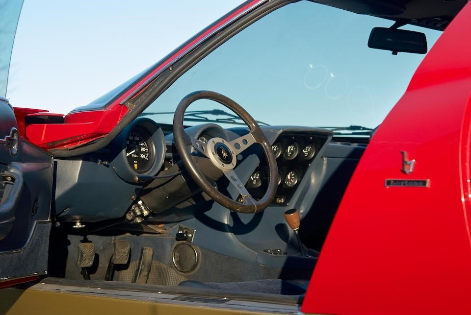 3087 : 1967, P400, Rosso Miura, jantes et bas de caisses argent, cuir Senape, console et volant bruns.