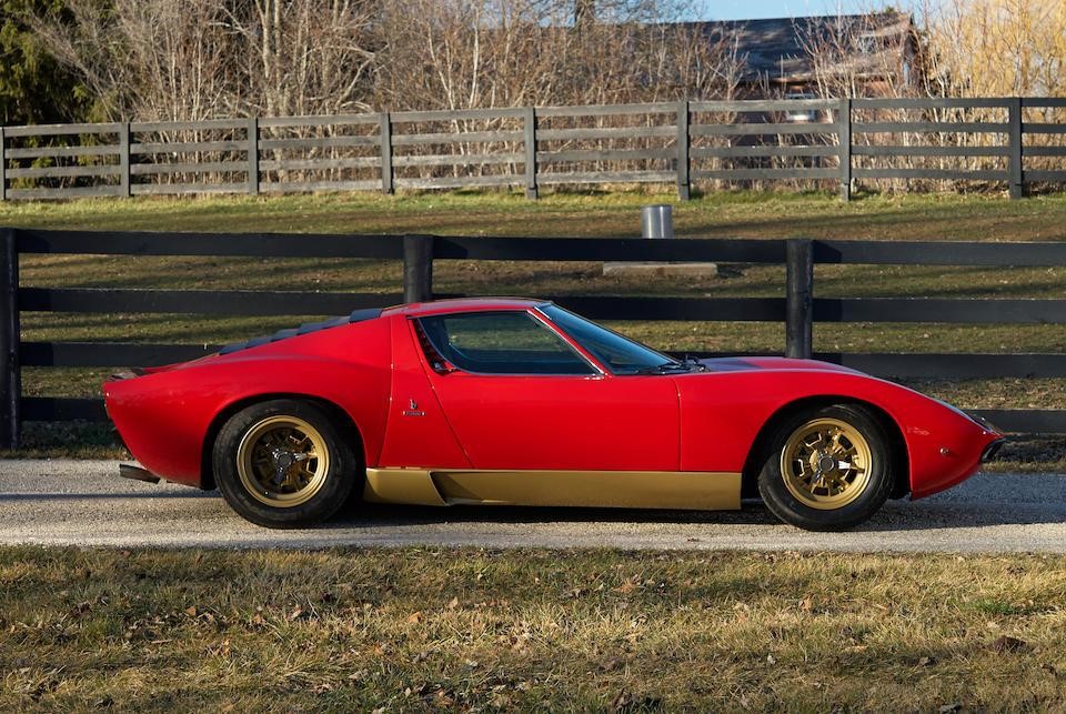 4972 : 13/12/1971, P400SV (caisse 771), moteur 30676, jantes or, Rosso Corsa, bas de caisse or, cuir Naturale.