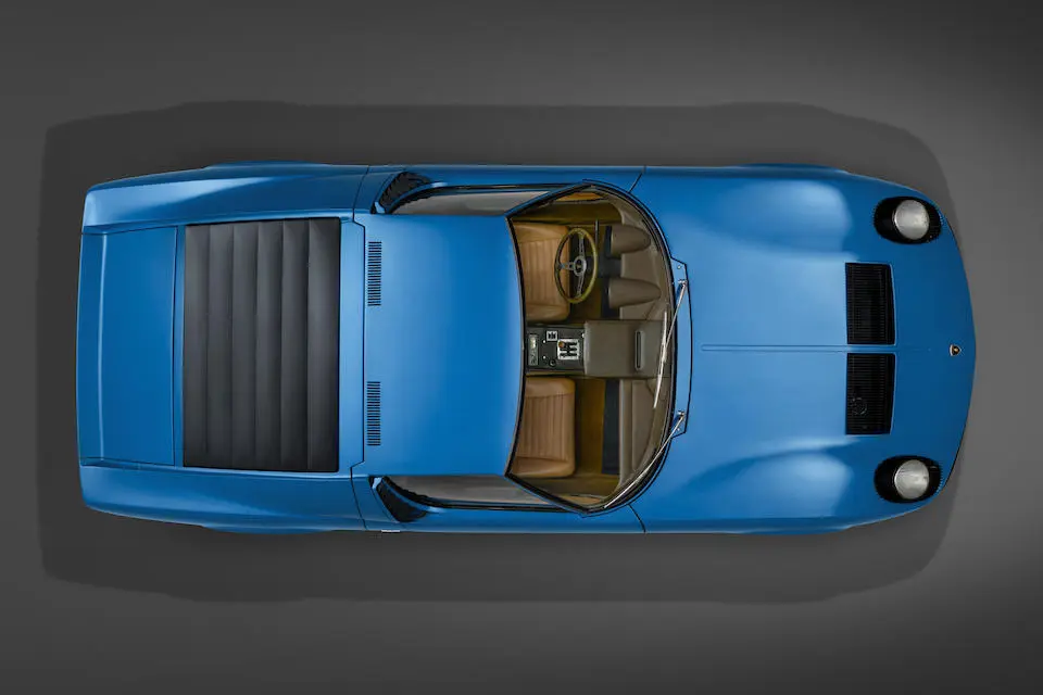 5066 : 12/05/1972, P400 SV, moteur 30728, climatisation Borletti, Blu Tahiti, bas de caisses et jantes or, cuir blanc.