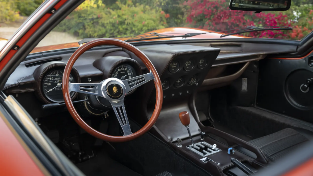3087 : 1967, P400, Rosso Miura, jantes et bas de caisses argent, cuir Senape, console et volant bruns.