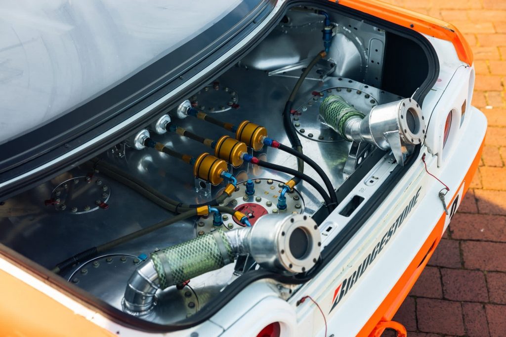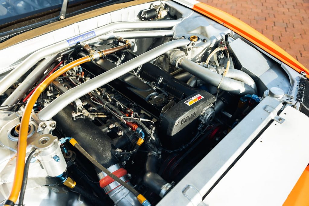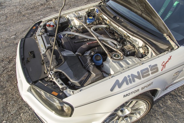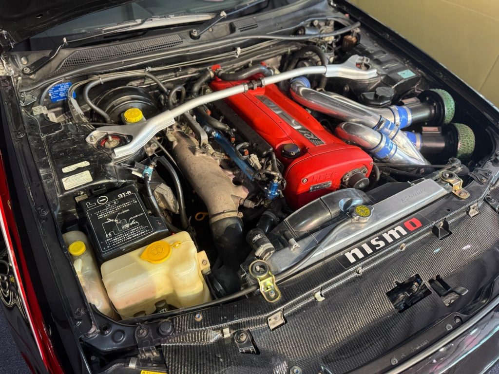 Vspec : Moteur RB26DETT basé sur le bloc N1 renforcé et préparé par NISMO avec éléments mobiles équilibrés et allégés, nouveaux pistons, nouveaux profils d’arbres à cames, admission et échappement variables, turbocompresseurs et échappements modifiés donnant 450 chevaux. Couvercles de culasses peints Cherry Red.