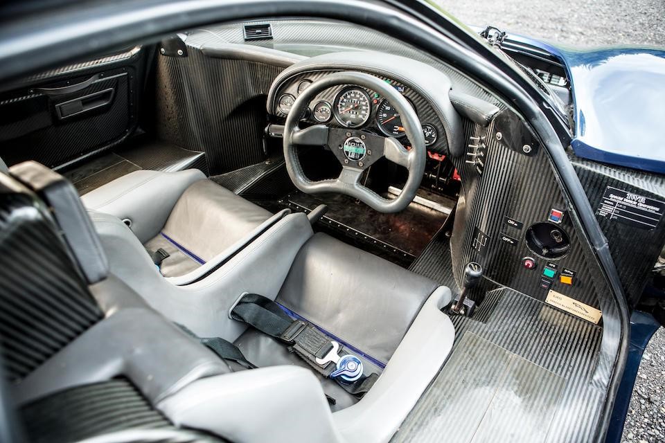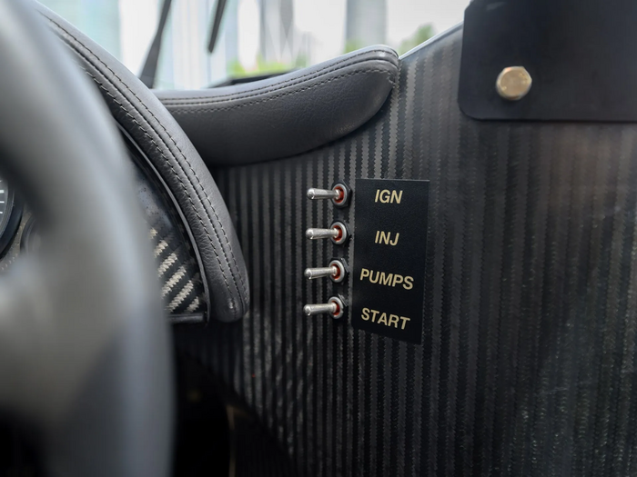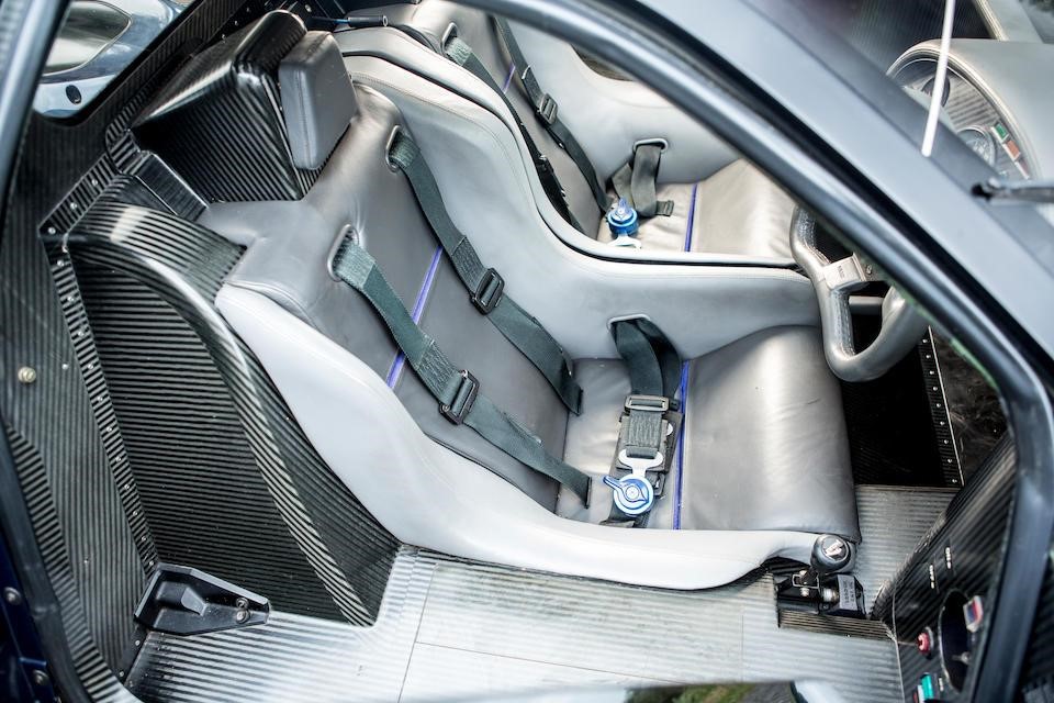 Habitacle sportif avec sièges baquet à coque kevlar et plastique, garnitures cuir pour les sièges et le tableau de bord qui conserve une instrumentations par cadrans ronds.