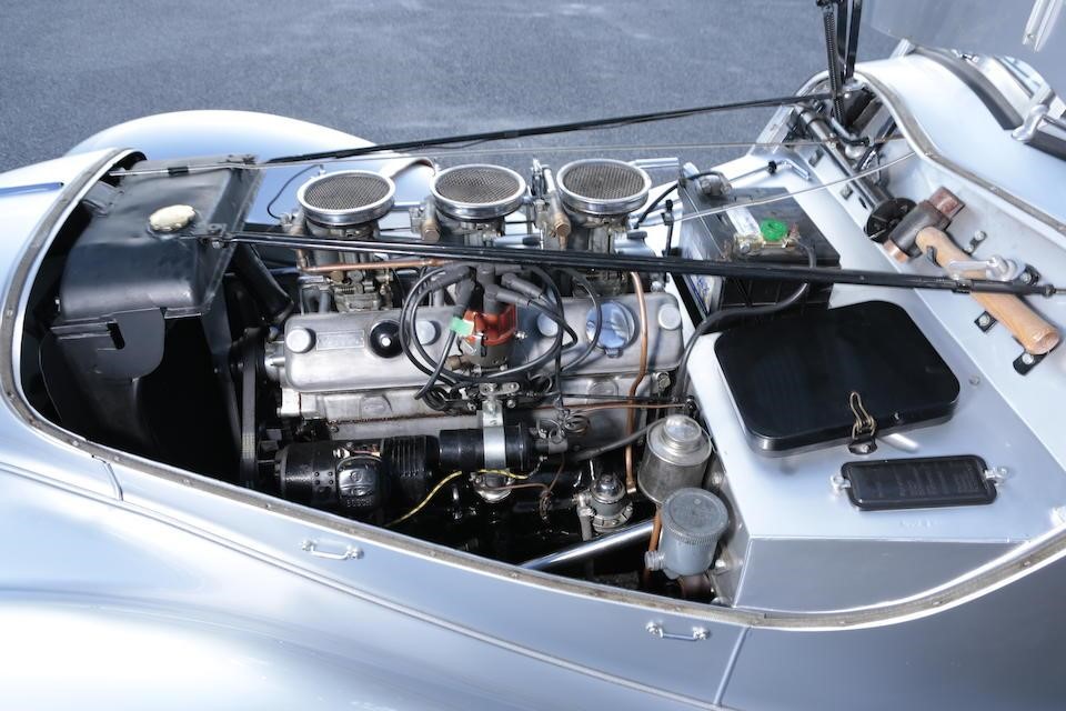 Alimentation par 3 carburateurs Solex inversés 30 JF placés au sommet de la culasse entre les rampes de culbuteurs pour améliorer les passages de gaz ce qui entraîne des problèmes d’accès aux bougies nécessitant la conception d’une clé à bougies spéciale)