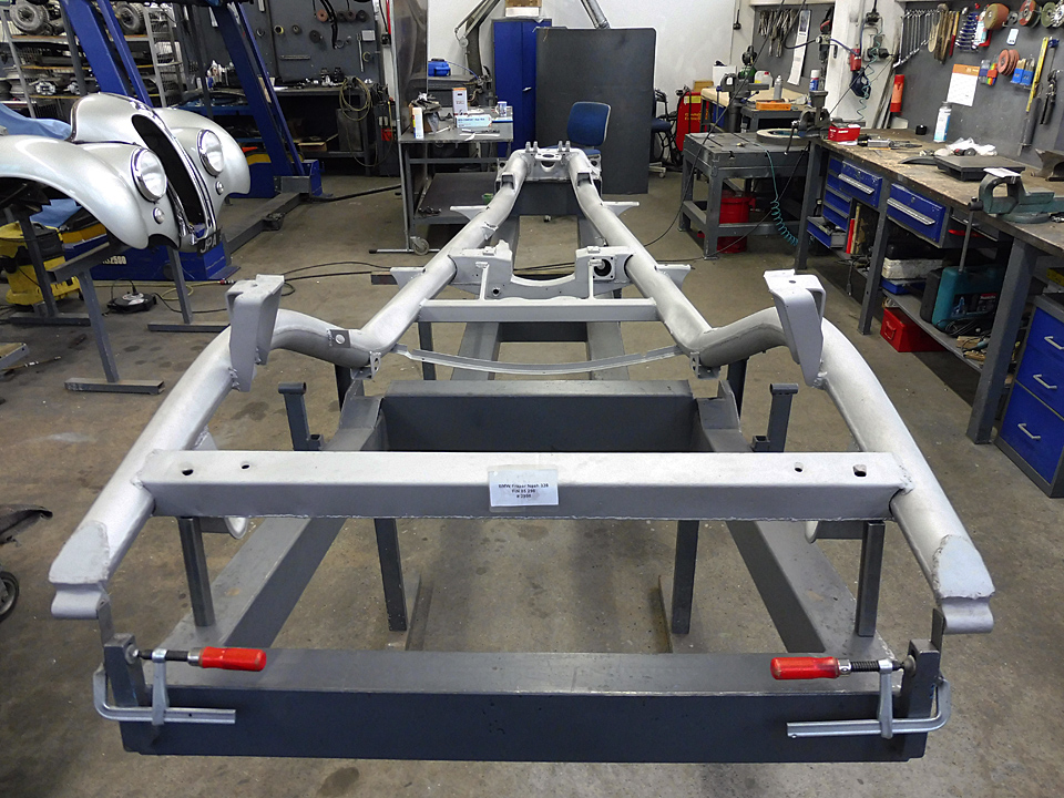 Châssis en forme d’échelle formé de deux gros tubes formant longeron réunis par des traverses de section carrée (à cette époque les voitures ont des cadres en échelle formés de profilés en U).