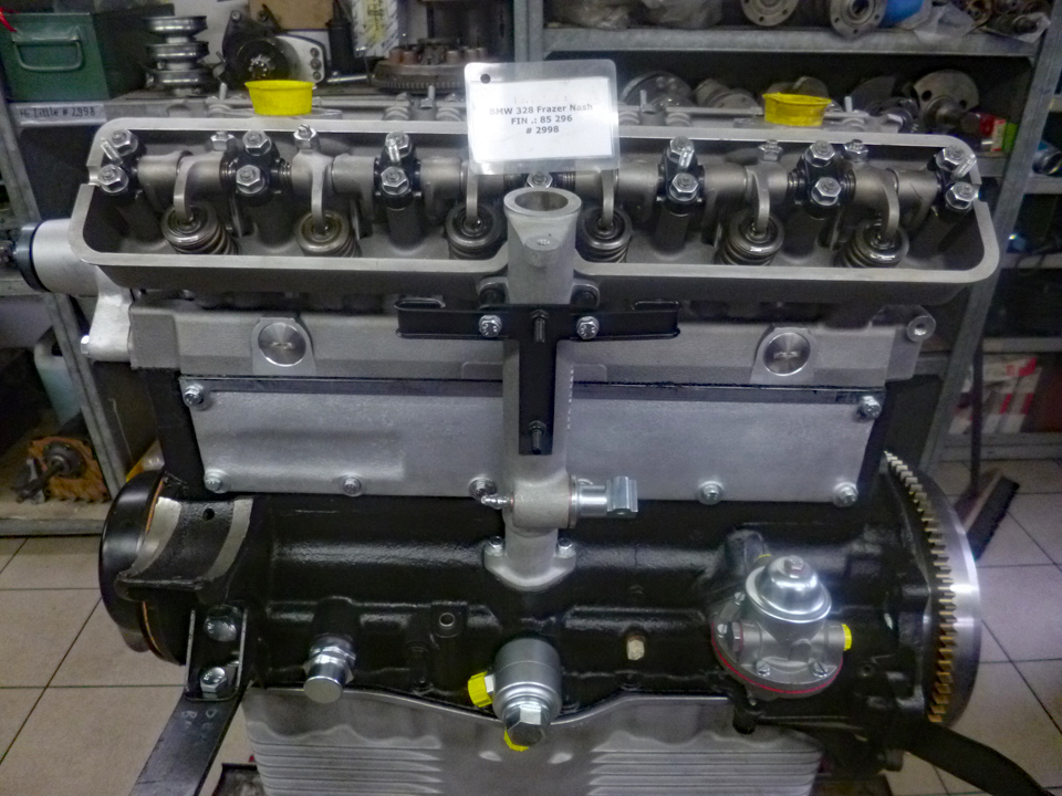 Nouvelle culasse en aluminium dessinée par Rudolf Schleicher et distribution revue. La 328 conserve l’arbre à cames latéral pour des raisons de coûte de fabrication mais reçoit deux bancs de culbuteurs, un pour l’admission et un pour l’échappement, de longueurs inégales avec un système de renvoi inédit pour transmettre le mouvement aux soupapes. Les soupapes froment un V à 90° et sont entraînées par des poussoirs horizontaux, les chambres de combustion sont hémisphériques. la culasse est coiffée de deux cache-culbuteurs séparés donnant un aspect de double arbre.