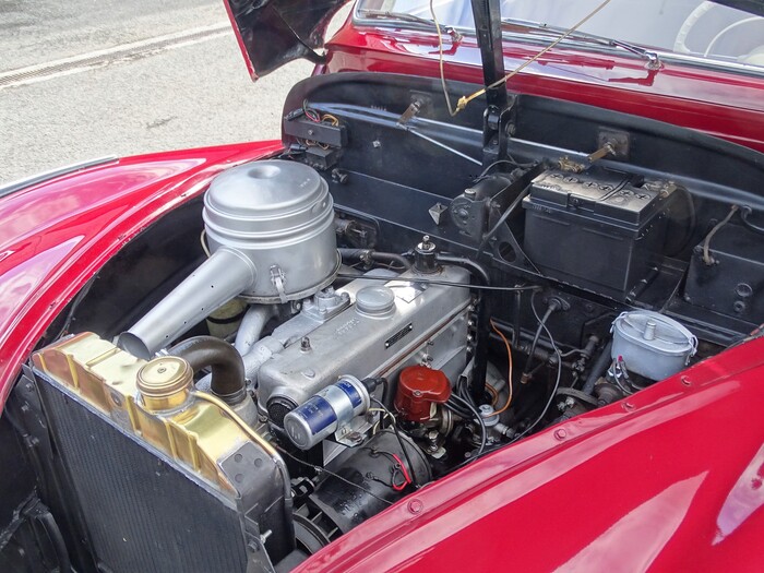 Distribution par un arbre à cames central actionnant des soupapes en tête redessinées par tiges et culbuteurs, nouvelles tubulures d’admission et d’échappement et chambre de combustion redessinée par rapport à la 326 d’avant guerre.