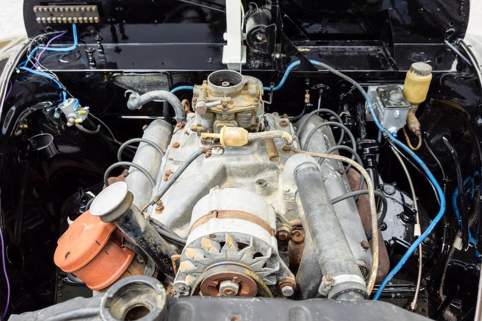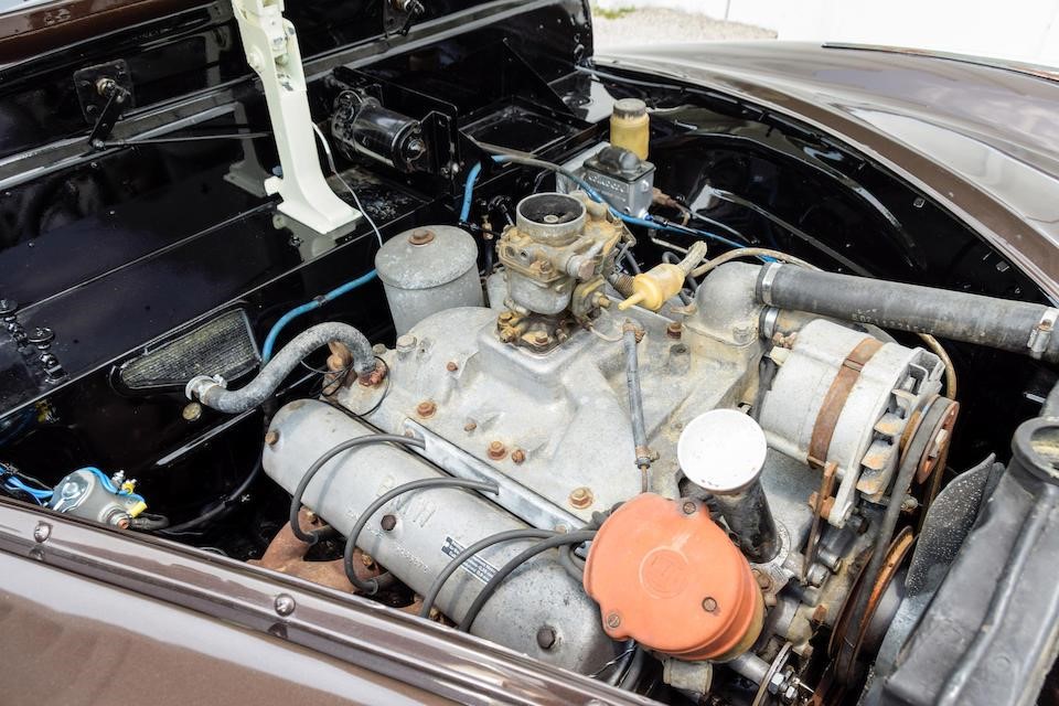 1954 : Présentation de la version 502 avec moteur V8 alimenté par 1 carburateur double corps inversé Solex 32 NDIX, 100 chevaux DIN à 4800 tours, 18,4 Mkg à 2500 tours.