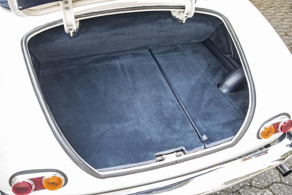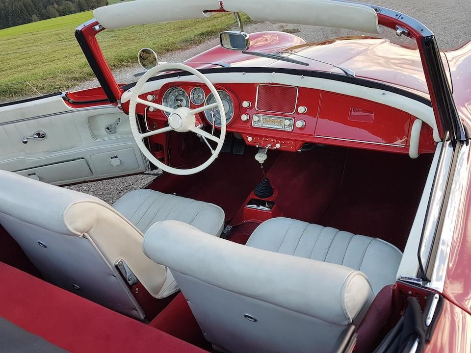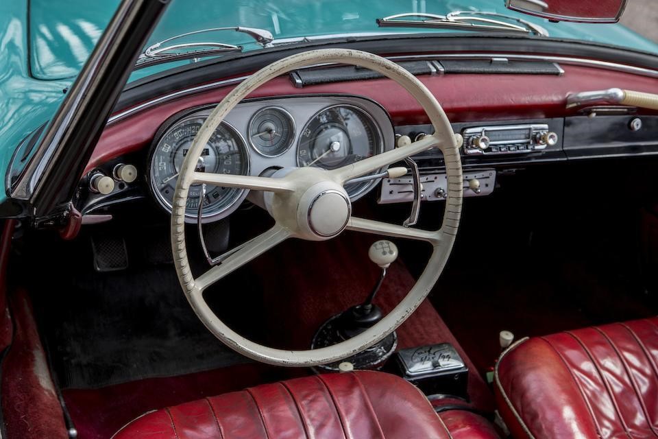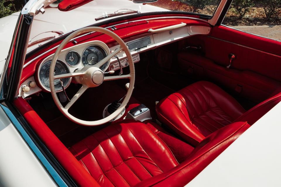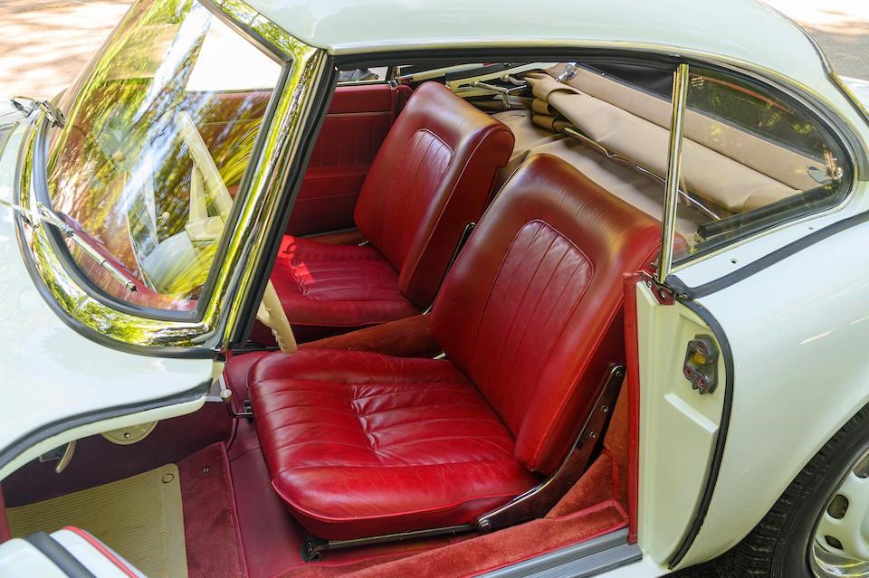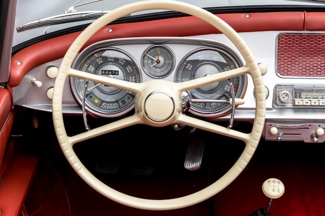 70044 : 07/1957, S1, moteur 40051, pneus flancs blancs, radio Becker Mexico, antenne électrique, hardtop, Blanc Papyros, cuir rouge.