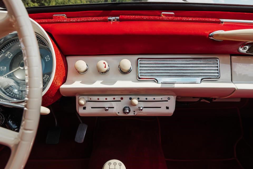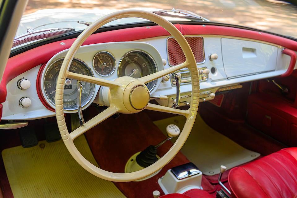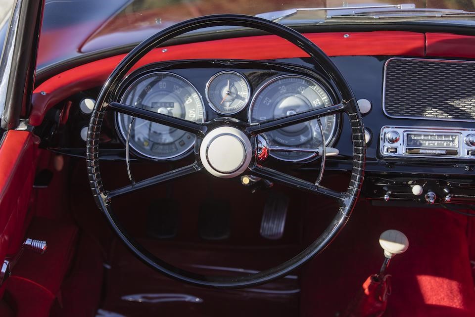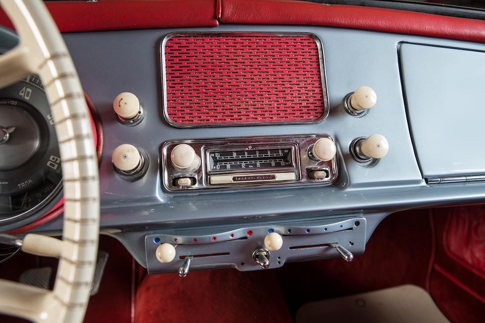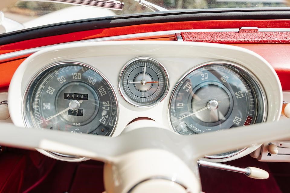 70044 : 07/1957, S1, moteur 40051, pneus flancs blancs, radio Becker Mexico, antenne électrique, hardtop, Blanc Papyros, cuir rouge.