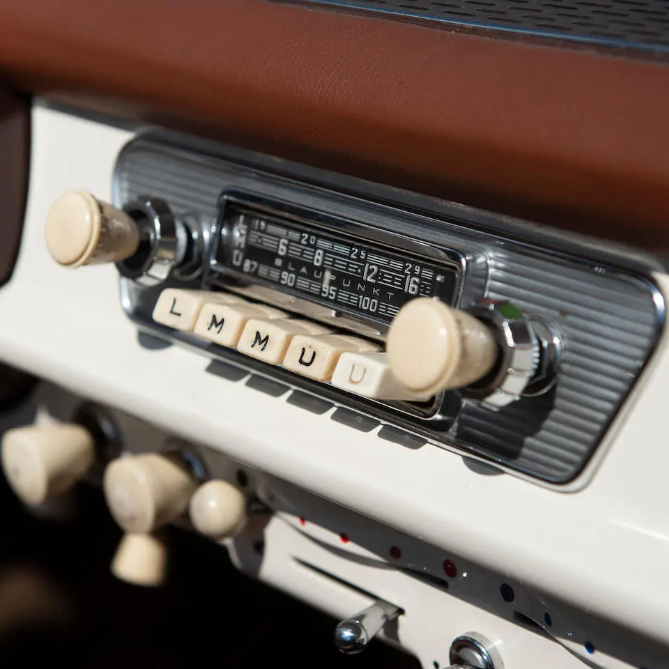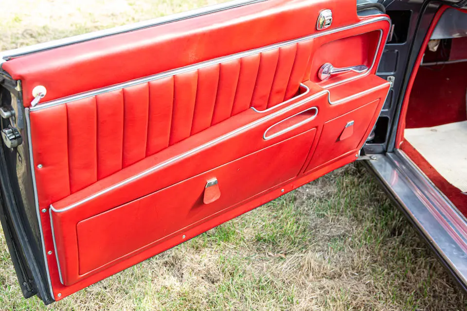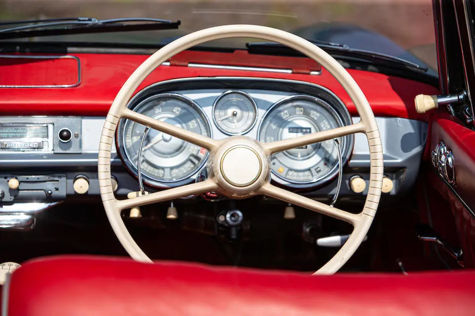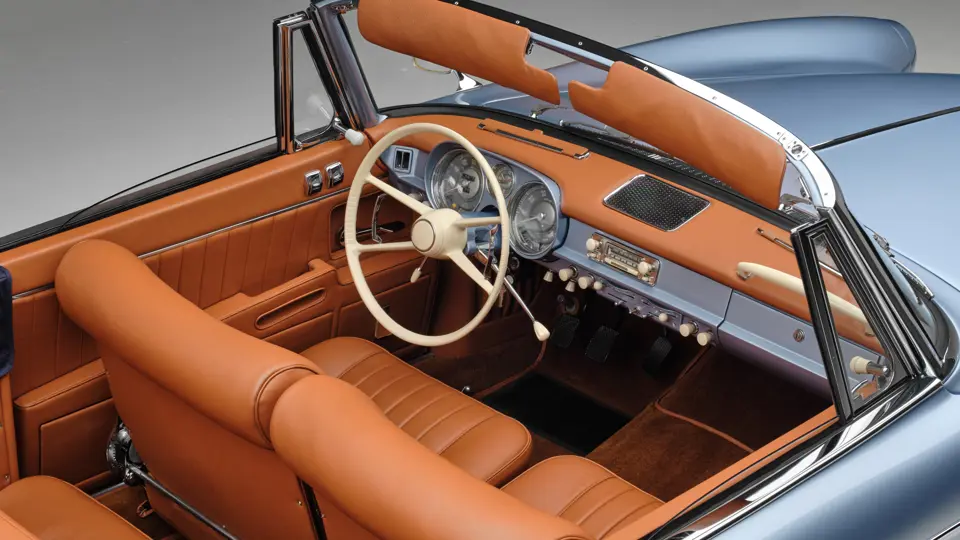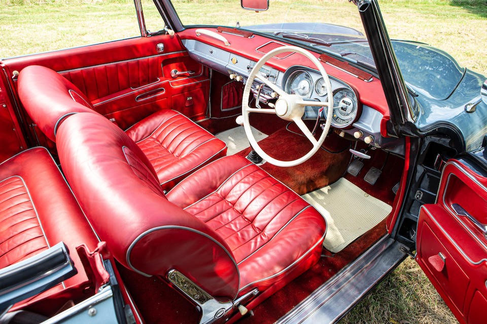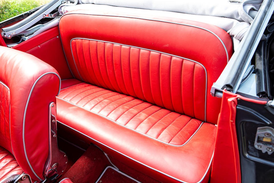 69 382 : 1959, Cabriolet Série II, radio Becker Mexico, Rouge, cuir bleu foncé.