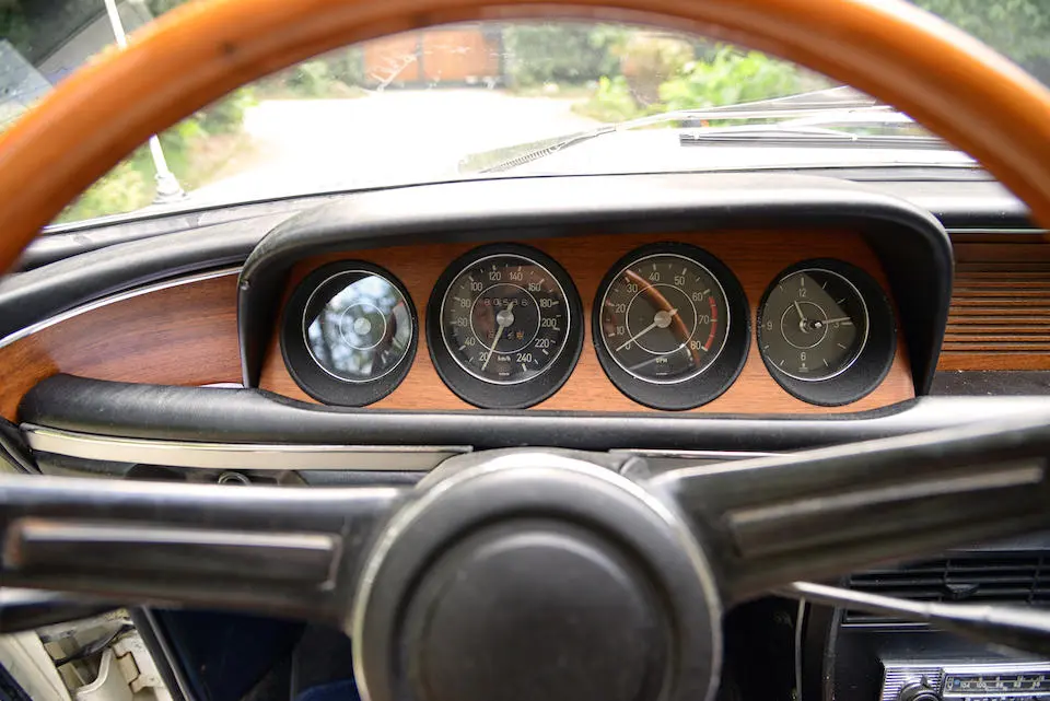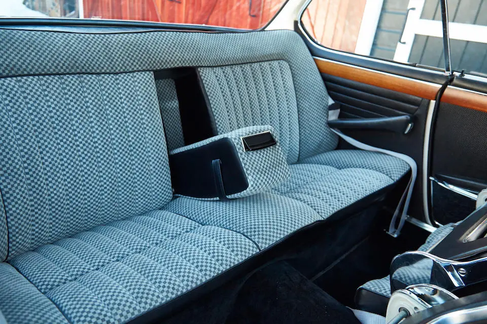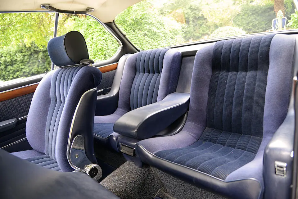 Abandon des vitres à commande électrique, sièges baquets Scheel. Volant sport à 3 branches et conservation des boiseries du tableau de bord. Intérieur en vinyle avec inserts tissu.