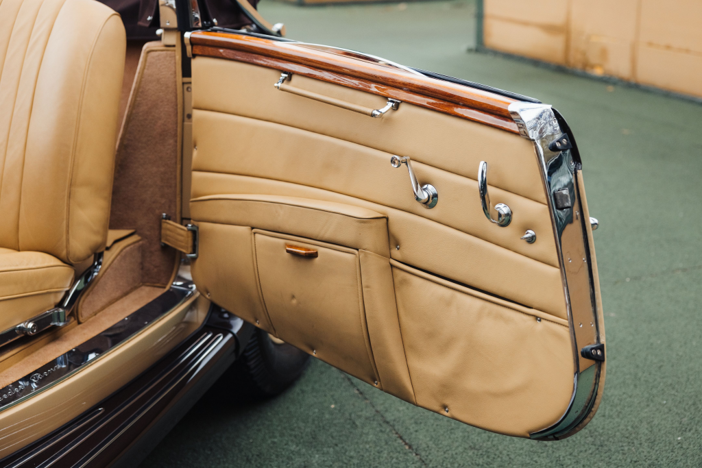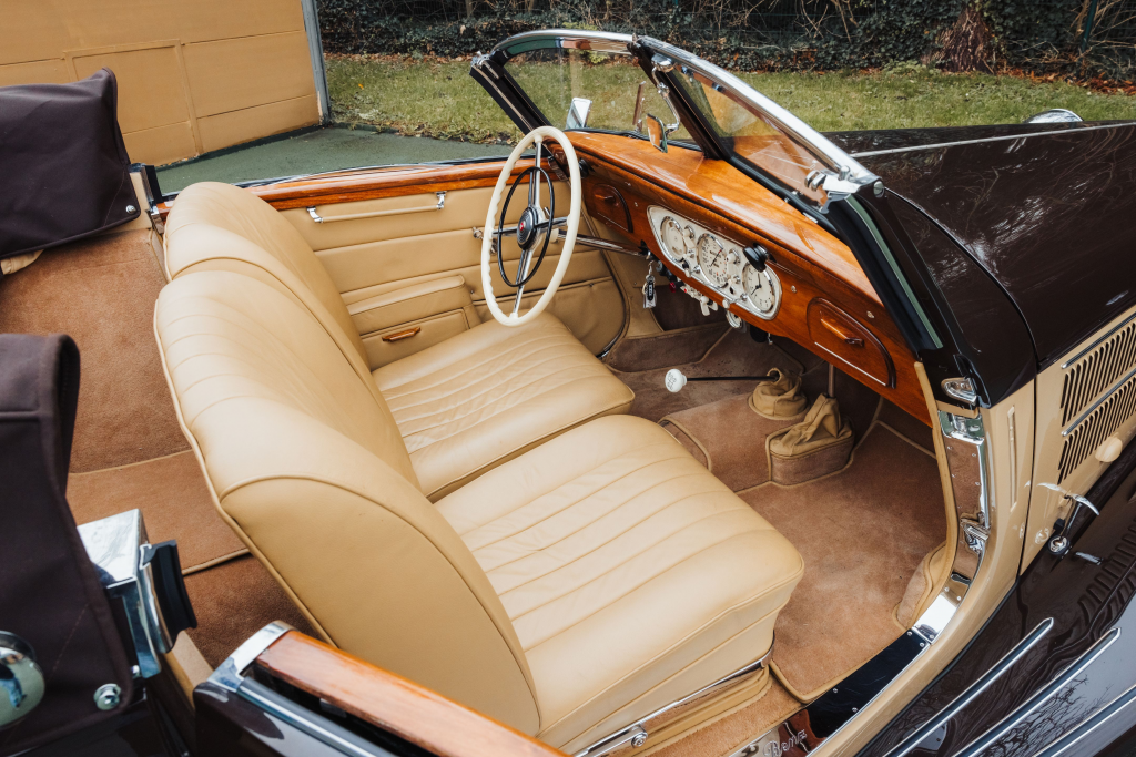 408153 : 1938, Kombination Roadster dans le style cabriolet A, LWB, phares Bosch, feux antibrouillards, pare-brise en V ouvrant en 2 parties, tableau de bord à inserts nacrés, volant banjo, radio.