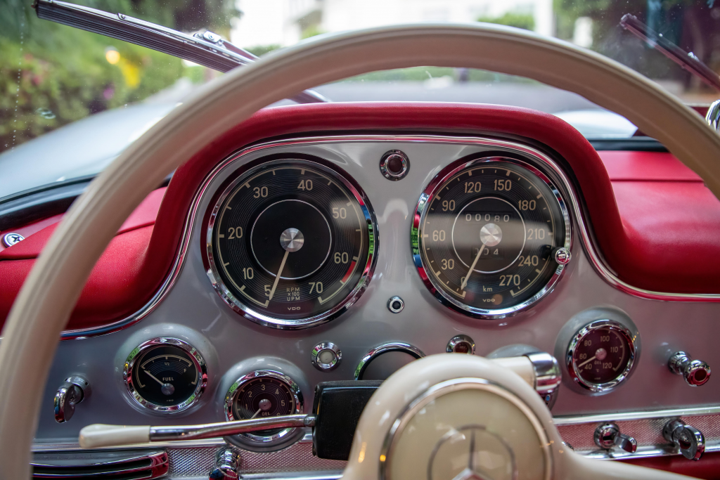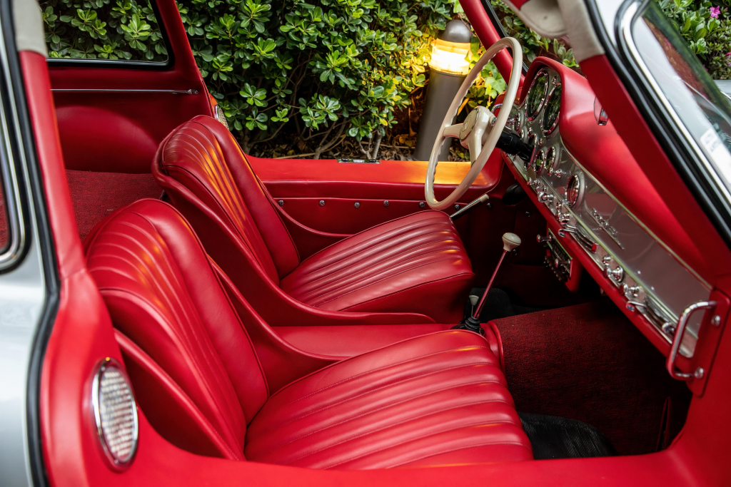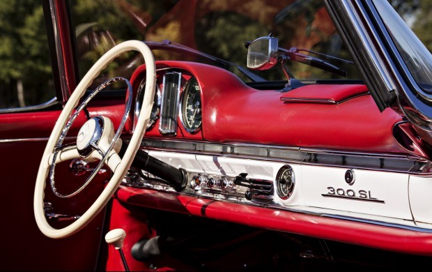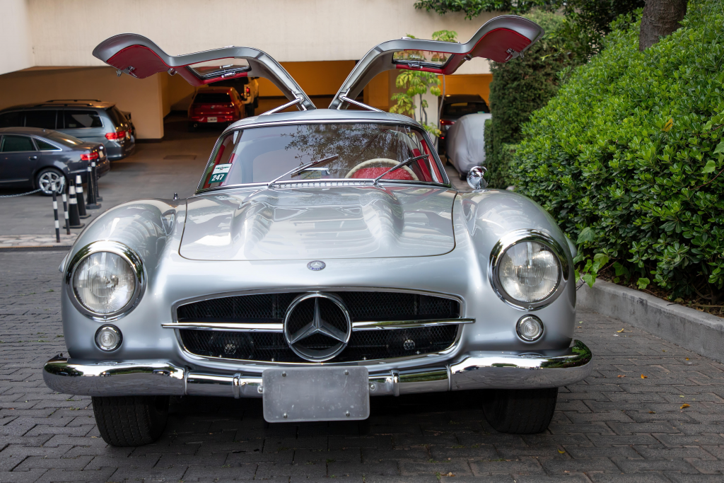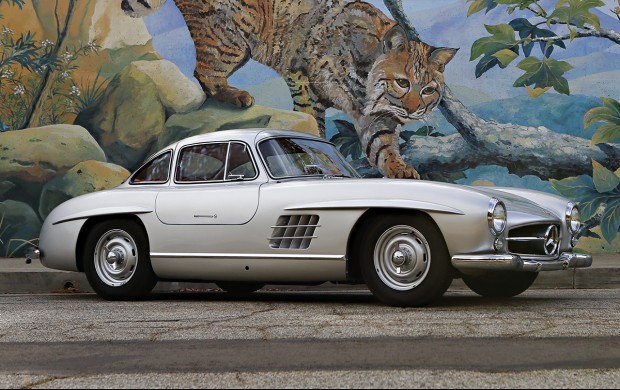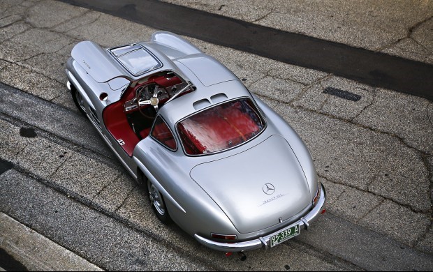 Présentation de la 300 SL (Sport Leicht), Type W (Wagen) 194 le 12 mars 1952. Voiture avec portières découpées dans le pavillon s’arrêtant juste sous la vitre latérale d’ou l’appellation gullwing : ailes de mouette. 11 voitures sont fabriquées avec alimentation par 3 carburateurs monocorps inversés Solex en 1952 et carrosserie coupé ou roadster.
