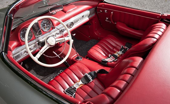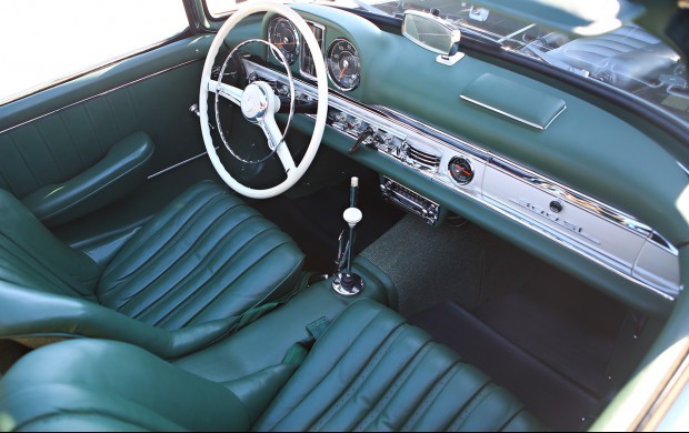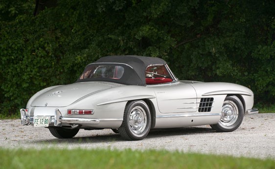 1957 : Salon de Genève (CH) : Présentation du roadster qui remplace le coupé à la demande de Max Hoffmann, importateur pour les Etats-Unis. Nouveau dessin de la partie arrière de la structure multitubulaire, à partir du pare-brise pour tenir compte de la nouvelle répartition des efforts et pour adapter une nouvelle suspension arrière dérivée de la 190 SL (1954). La suspension conserve le principe de l’essieu brisé en ne mettant en jeu qu’un seul demi arbre oscillant dont la trompette s’articule sur un pivot placé le plus bas possible sous le carter de différentiel pour abaisser le centre de dévers (limite le roulis et les variations de carrossage), ajout d’un ressort compensateur transversal situé au-dessus du pont et sollicité à ses extrémités par des bras verticaux solidaires de chacun des demi-essieux pour accroître la raideur de la suspension en oscillations verticales et transférer une partie de la charge de la roue délestée lors des appuis en courbe ou quand le revêtement est bosselé pour améliorer la motricité.