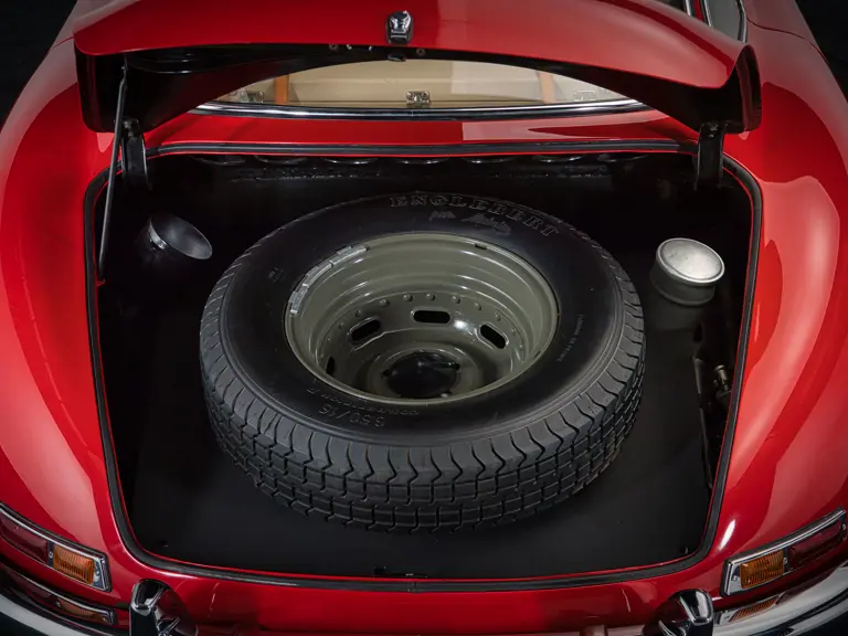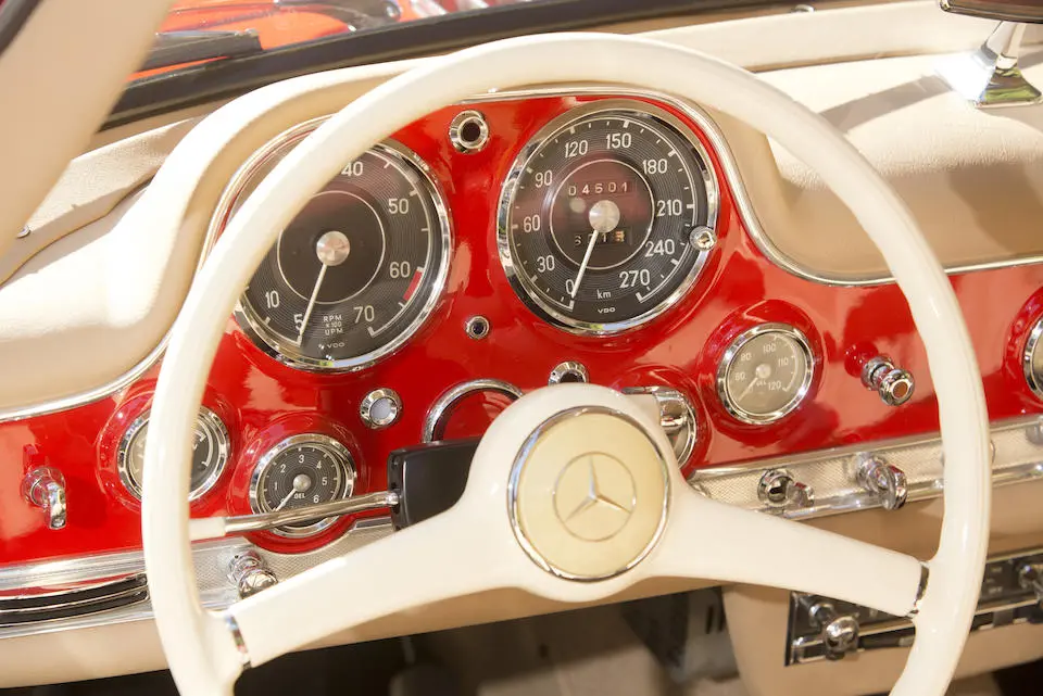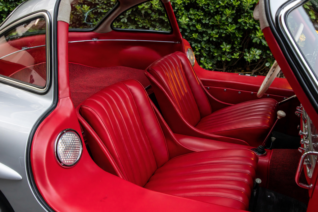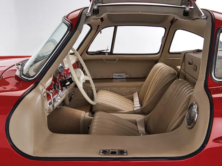 7500079 : 15/05/1957, 300 SL, dernière de la série (caisse 198.040.7500076), moteur 198.980.7500092, boîte de vitesses 7500087, boîtier de direction 5500710, pont av.: 7500084, pont arr. : 7500024, jantes de 300 SL roadster (15×5 1/2), instrumentation aux normes US, Rouge pompier, cuir crème.