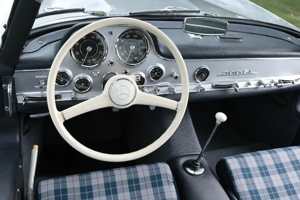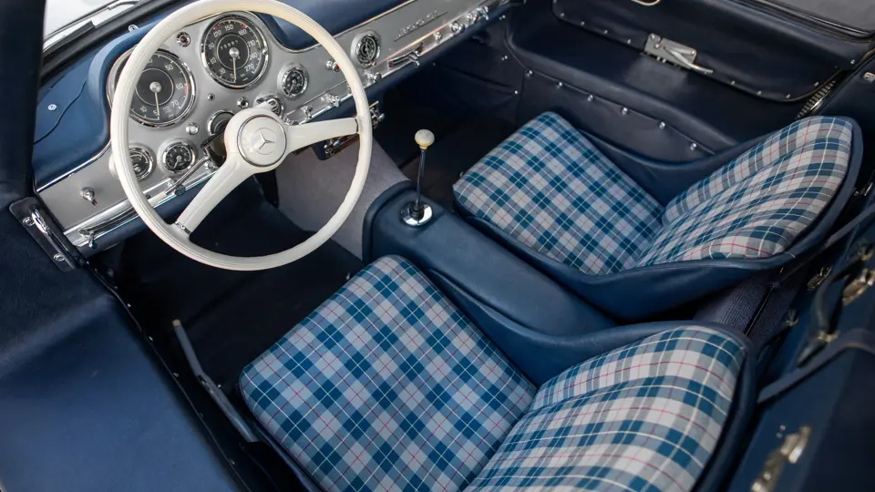 198.043.5500332 : 05/1955, 300 SL Caisse aluminium (n°A198.043.5500013), 1/29, moteur 198.980.5500346, rapport de pont : 3,42 :1, compteur gradué jusqu’à 270 km/h, vitres en plexiglas, radio Becker, Gris argent métallisé (DB180), vinyle et drap écossais bleus (L1).