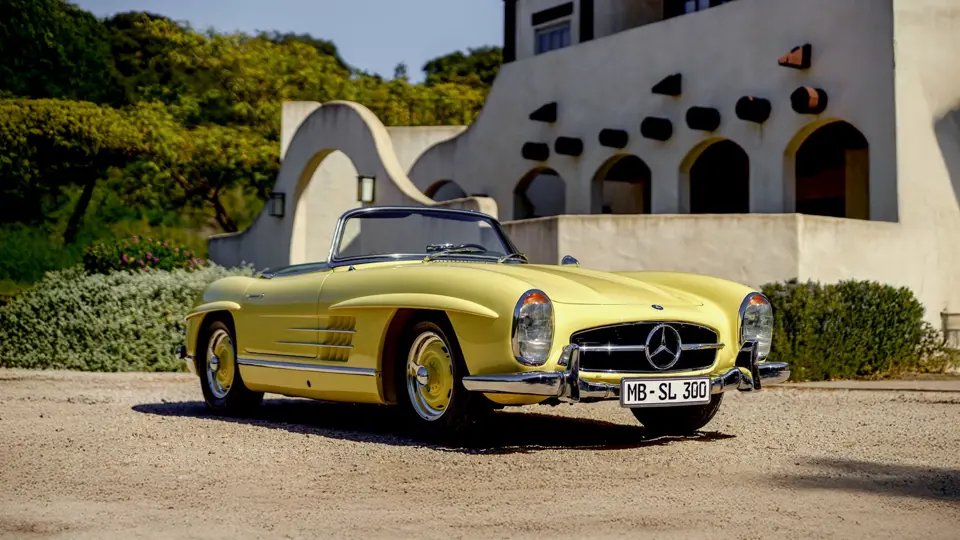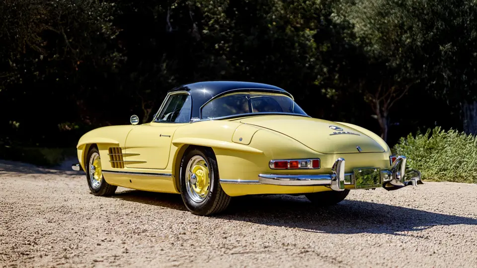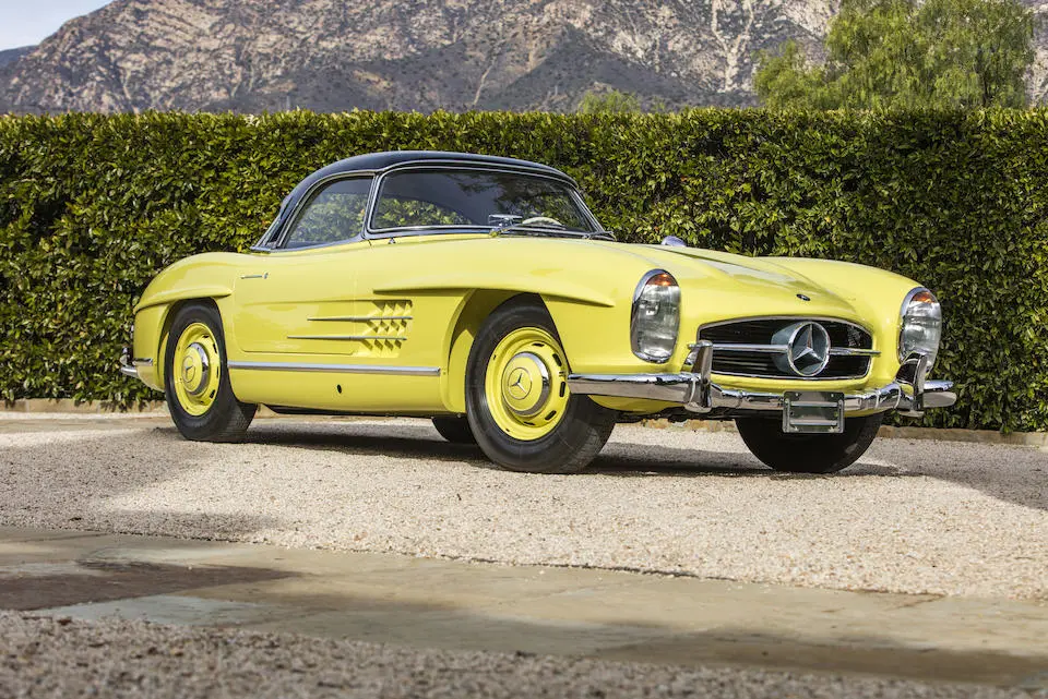 198042.10.002576 : 1960, 300 SL Roadster, moteur 198980.10.2627, Uranium Gelb (DB662G), cuir noir, capote noire.