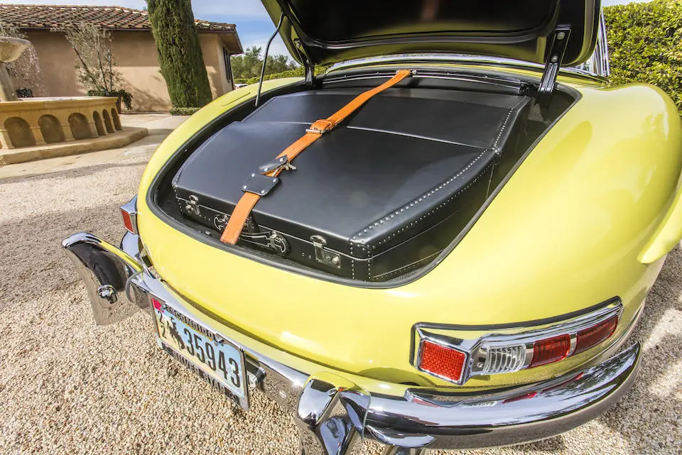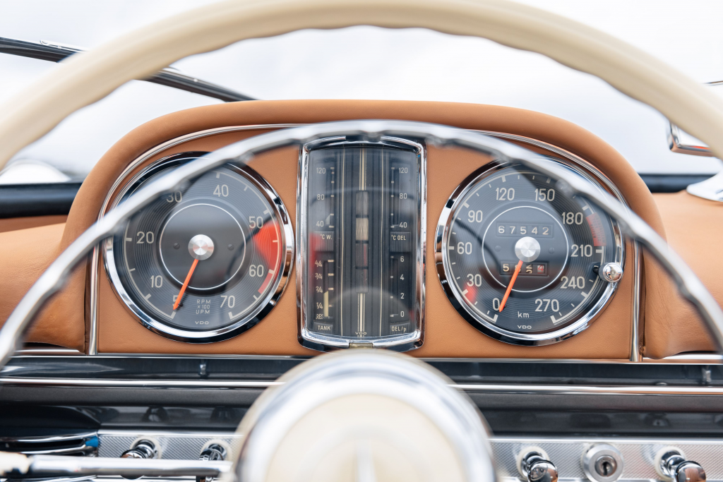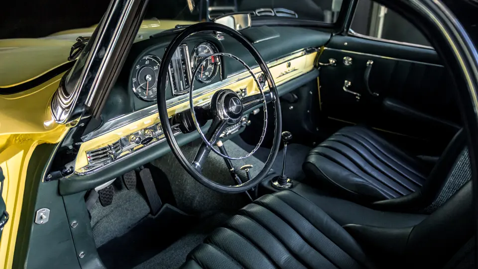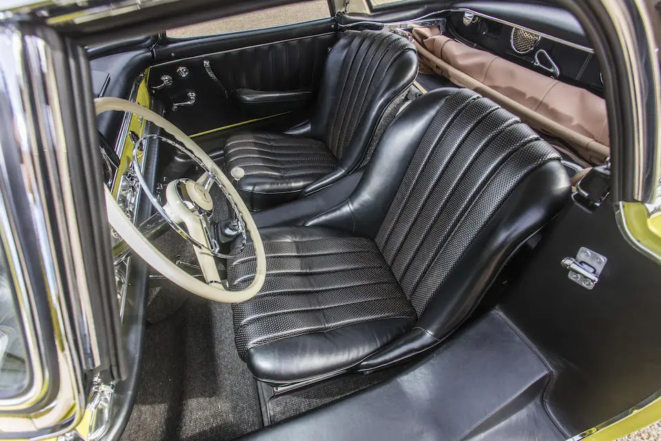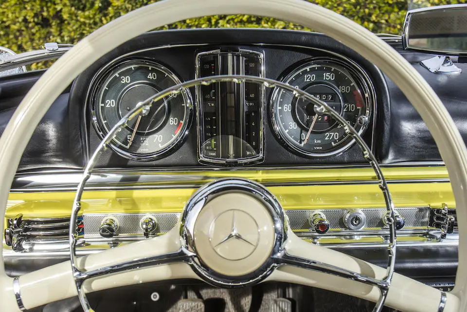198.042.10.002756 : 1961, 300 SL Roadster (caisse 198.042.10.00266), boîte de vitesses 002986, jantes 15″ Kronprinz à enjoliveurs chromés, rapport de pont : 3,64 :1, instrumentation aux normes anglaises, Fantasy Gelb (DB653), cuir noir (872), hardtop noir (DB040) à ciel de toit crème (E4).