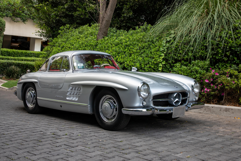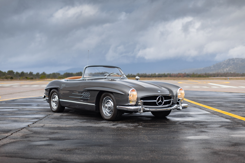 5500730 : 1957, 300 SL, préparation usine, pas de pare-chocs, pas de baguettes chromées sur la face avant, jantes à serrage central, moyeux Rudge, échappement latéral passant à l’intérieur des bas de caisse, tarage de suspensions course. Gris métallisé, intérieur cuir rouge.