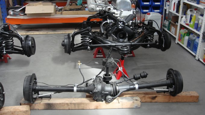 Suspension arrière par essieu brisé avec demi-axes oscillants et 2 jambes de force, ressorts hélicoïdaux et amortisseurs télescopiques,