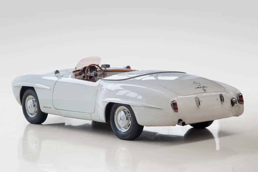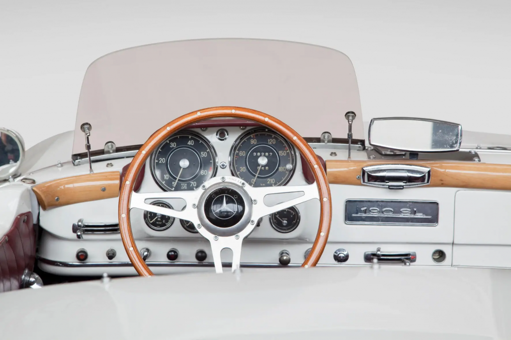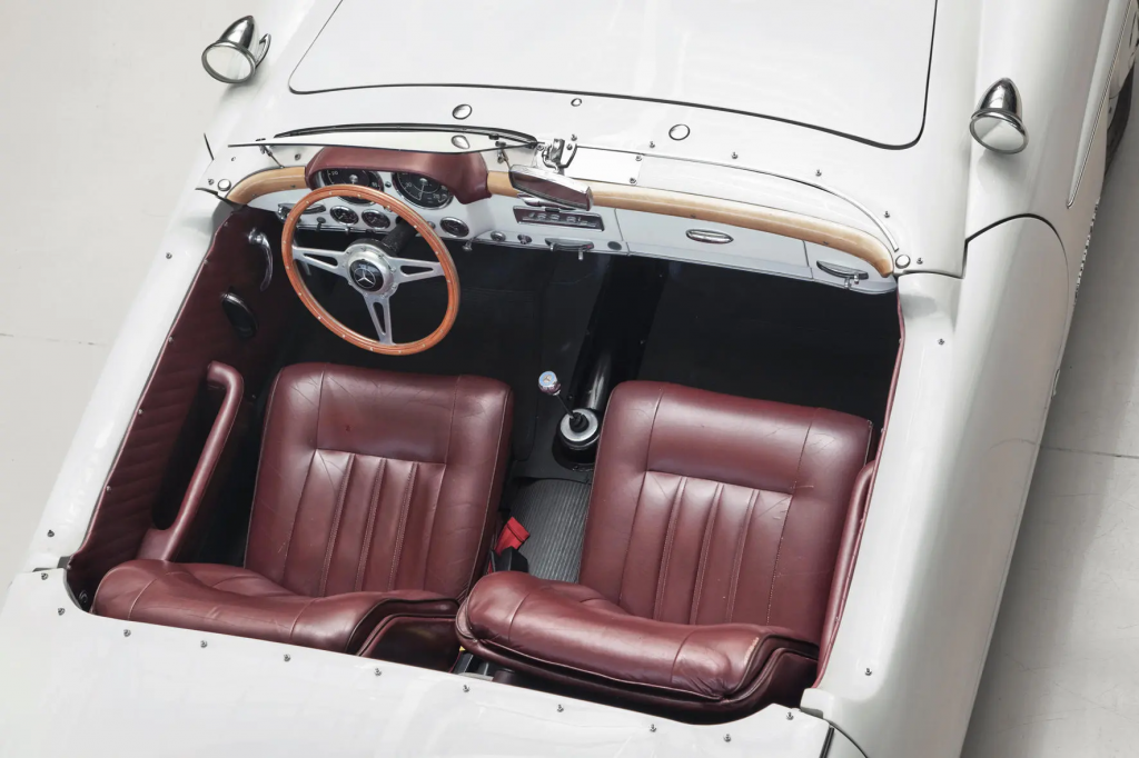 121.042.5500594 : 1955, 190 SL, kit Clubsport usine, phares antibrouillard, tambours Alfin, circuit hydraulique ATE, pare-chocs chromés avec bananes, 2 roues de secours, 2 rétroviseurs extérieurs, boîte à gant verrouillable, radio Becker Le Mans, antenne électrique, Blanche, cuir rouge.