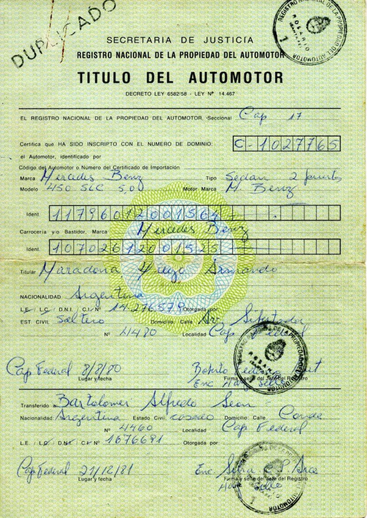 Vendue Diego Armando Maradona, 21480, Avenida Libertador, Cap Federal (ARG), cadeau de son club Boca Junior, Buenos Aires (ARG), livrée par Juan Manuel Fangio (importateur).