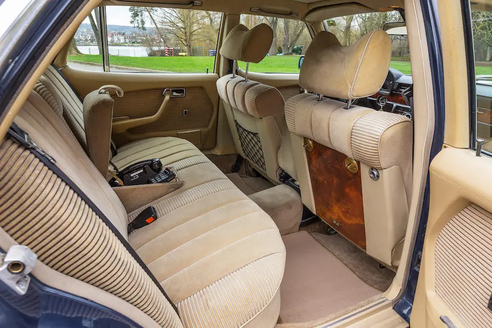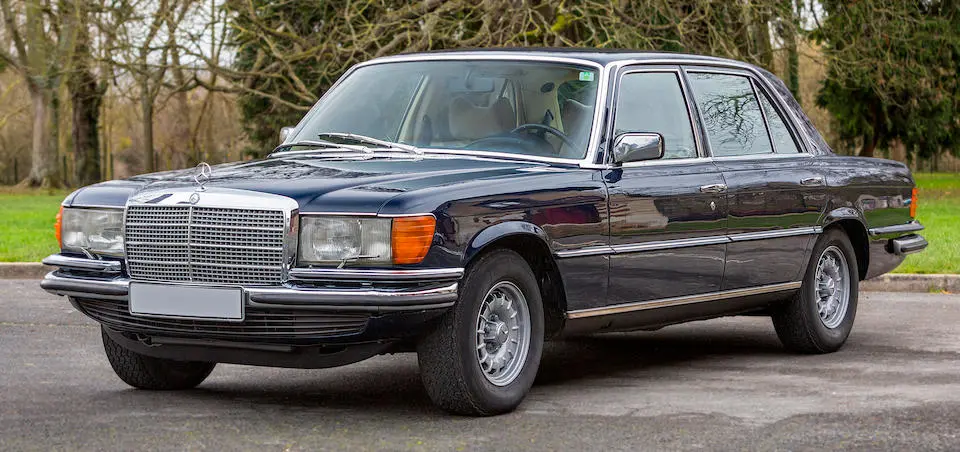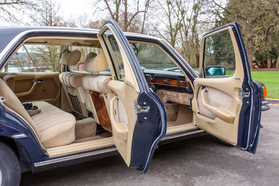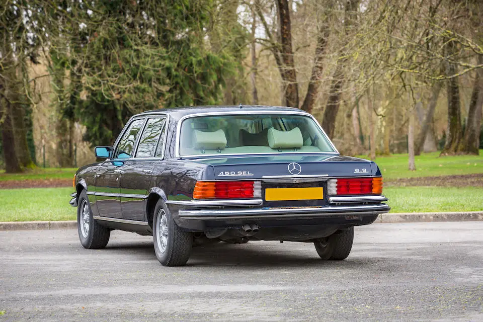 116.036.12004168 : 1978, 450 SEL 6,9l, moteur 100.985.12.004291, 2 téléphones Matra (avant et arrière), Bleu marine, velours beige Pullman