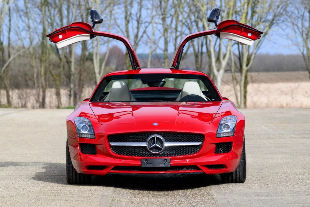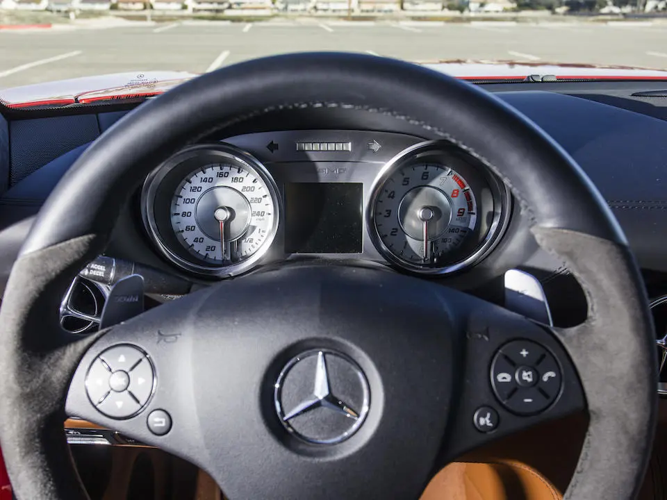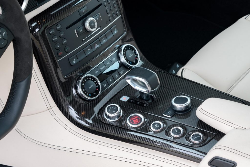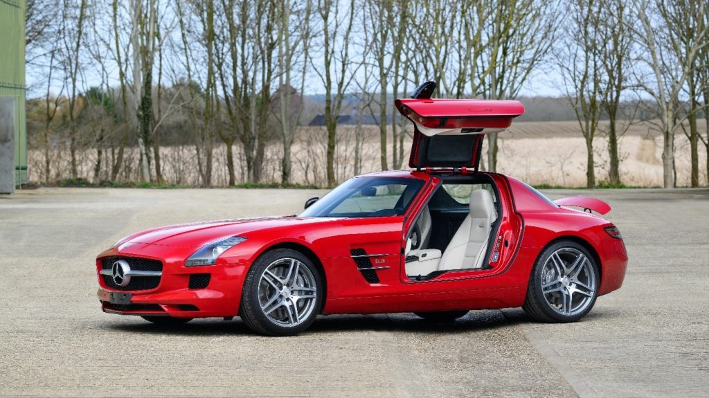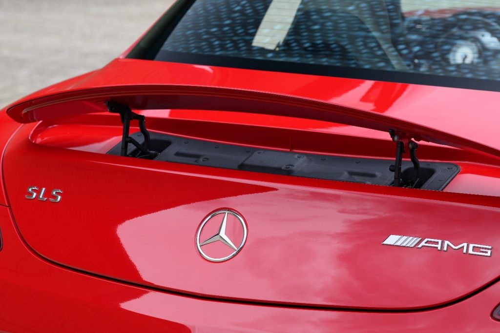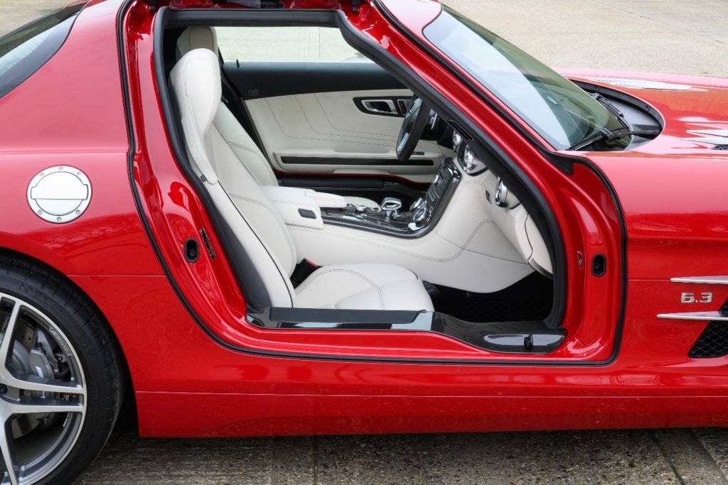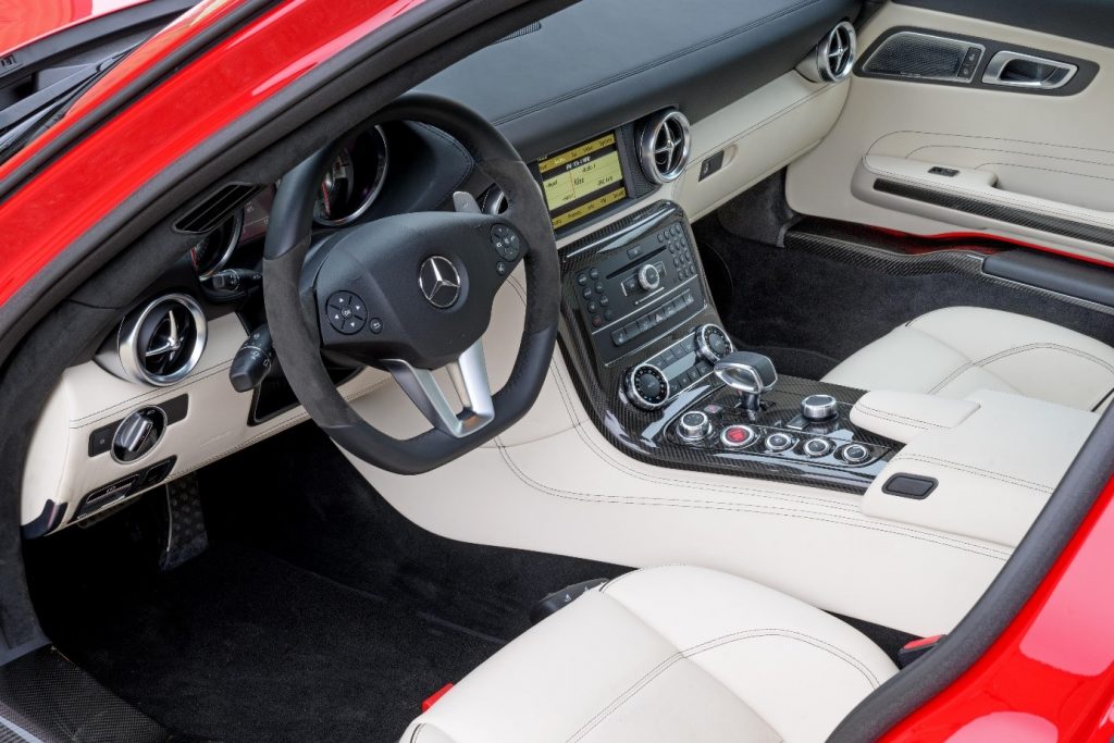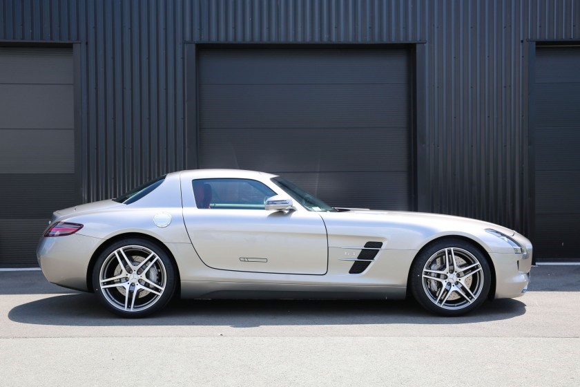 La SLS succède aux SLR Mc Laren dans le segment des voitures sportives exclusives. Elle reprend l’ouverture des portes papillon des 300 SL de 1955. La SLS (Sport Leicht Super) est la première voiture développée et étudiée par AMG avec le concours de l’usine (Mark Fetherston de Mercedes Benz), la mise en point se fait avec l’aide du pilote David Coulthard. Hartmut Sinkvist, responsable du design intérieur de la marque se charge de l’habitacle en s’inspirant des panneaux de commande aviation, sièges baquet à armature en magnésium, volant multifonction en cuir D. 365mm.