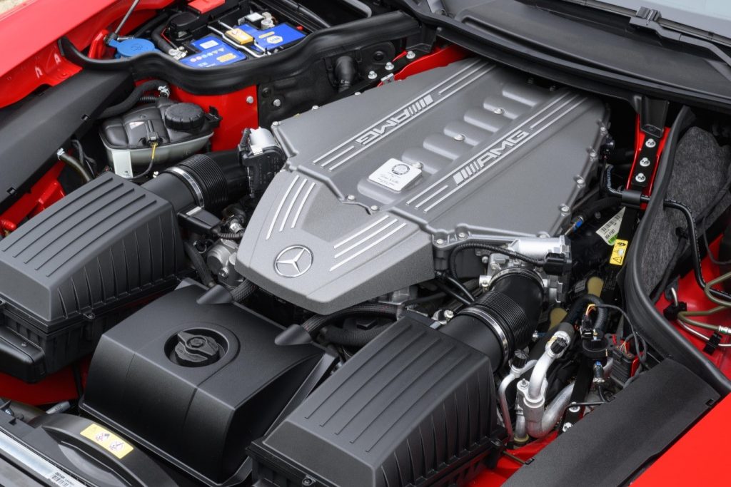 Vilebrequin équilibré sur 5 paliers en aluminium forgé. Pistons forgés, parois de cylindres traités (brevet AMG) permettant de limiter les frictions et augmenter la longévité, la plupart des boulons sont en aluminium.