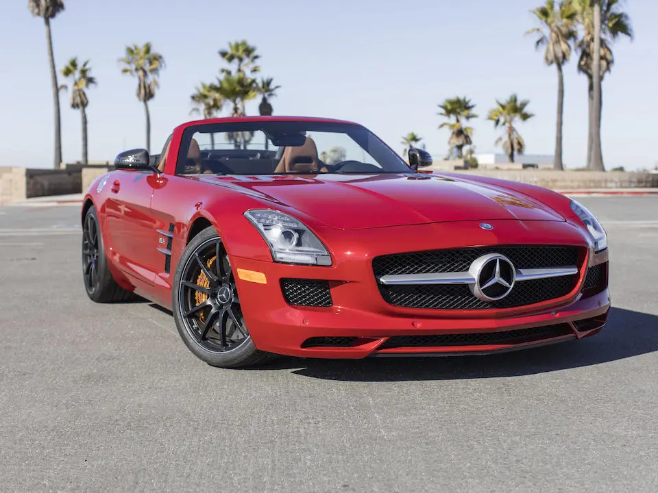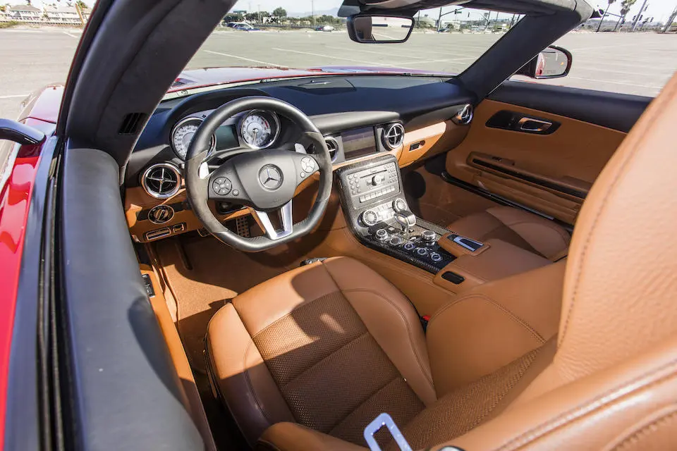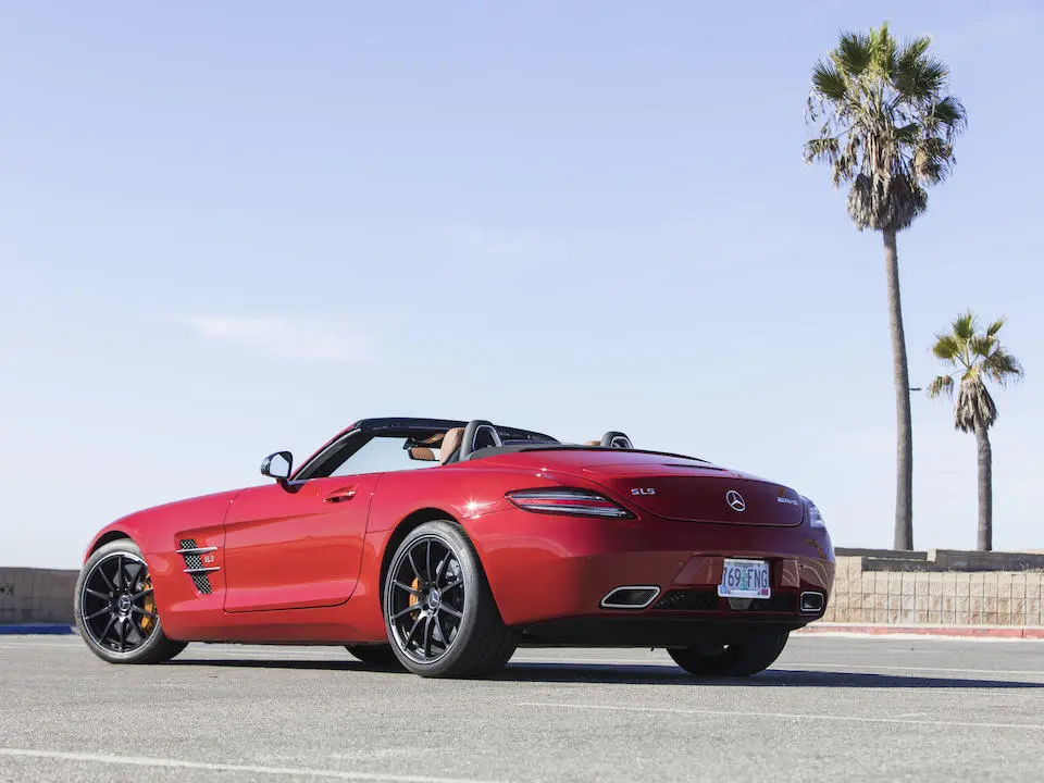 09/2011 : Salon de Francfort : La SLS est disponible en version découverte avec portes normales et capote à 3 épaisseurs sur armature magnésium, acier et aluminium, se déployant en 11 secondes jusqu’à une vitesse de 50 km/h. Renforts latéraux pour compenser l’absence de toit, renfort au niveau des montants de pare-brise, derrière les sièges au niveau de l’arceau se déployant en cas de retournement et entre l’arrière de l’habitacle et le réservoir. Le roadster pèse 40 kg de plus que le coupé (1660 kg).