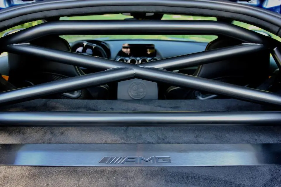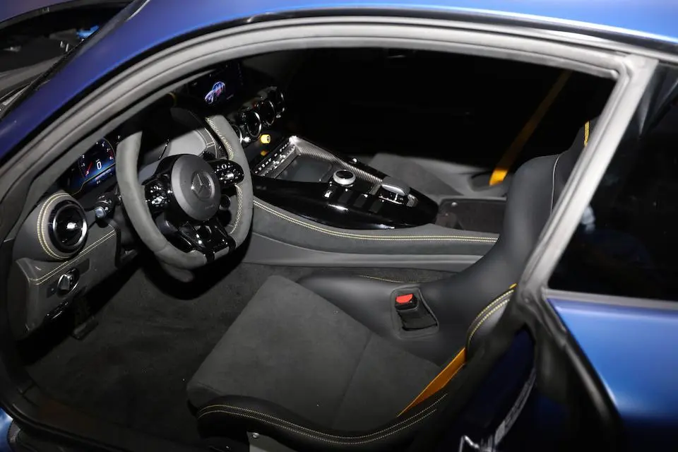 Sièges baquet carbone, écran 10″25, système audio Burmeister, démarrage sans clé, aide au parking. Arceau-cage, extincteur et harnais 4 poins disponibles en option.