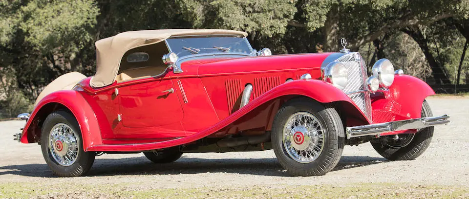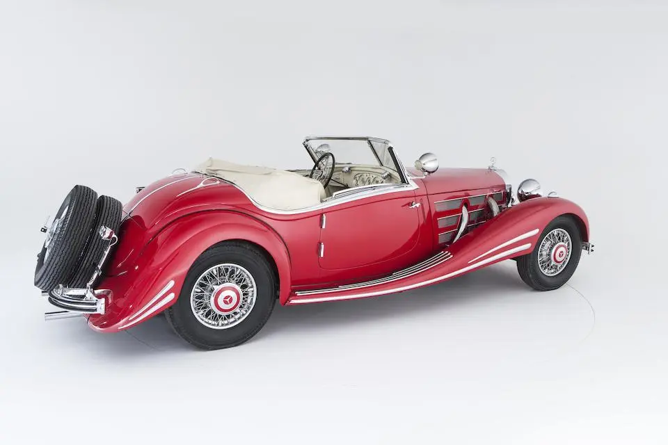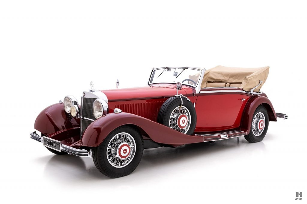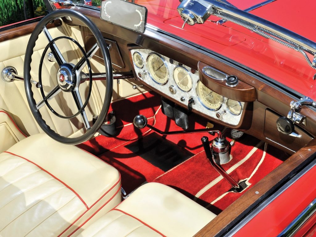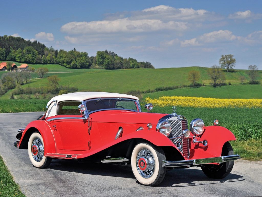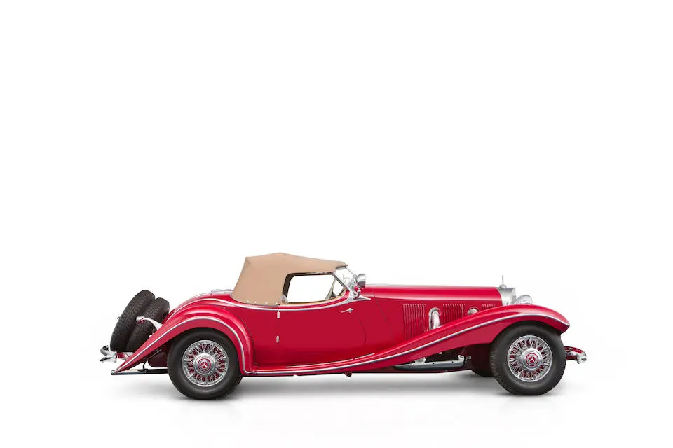 130 854 : 1936, 500 K, Roadster, moteur 130 854, rouge, capote crème, pneus flancs blancs, roues à rayons.