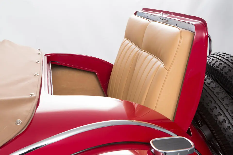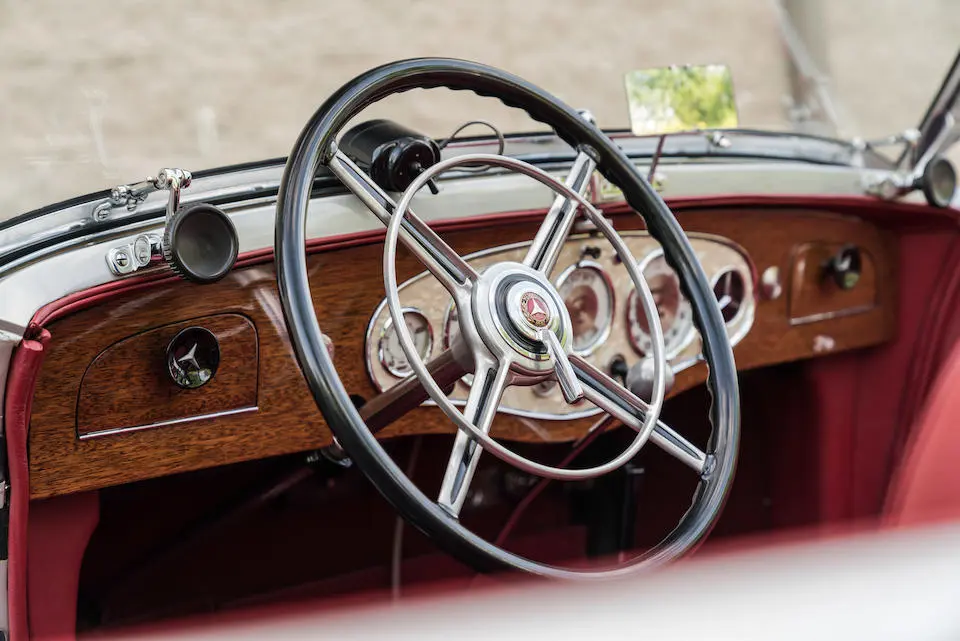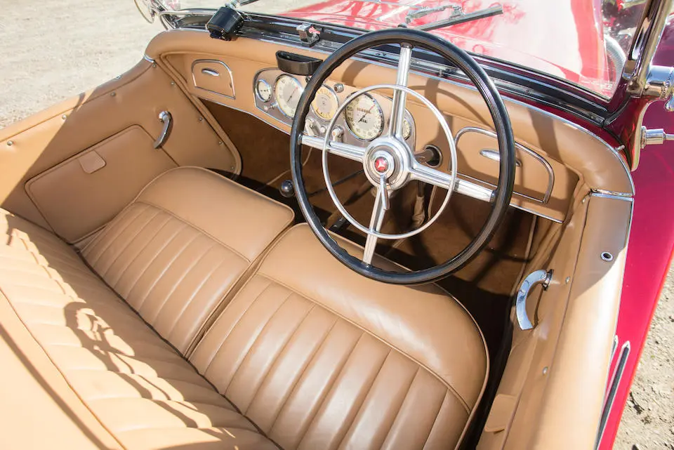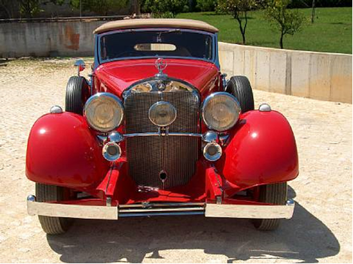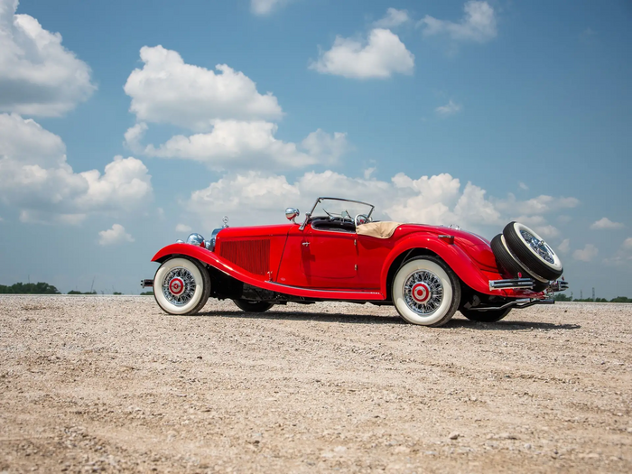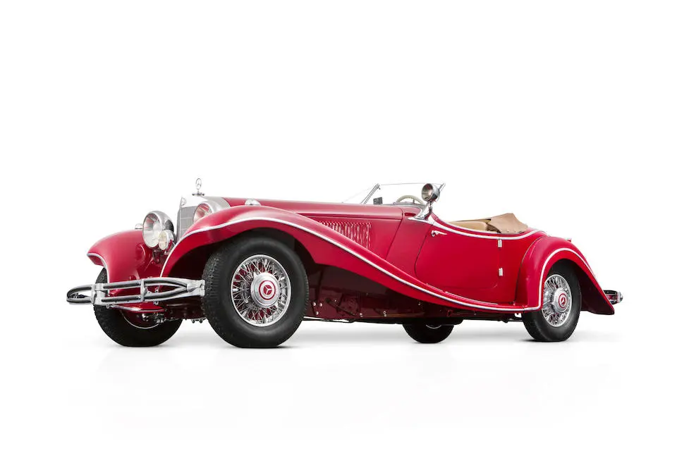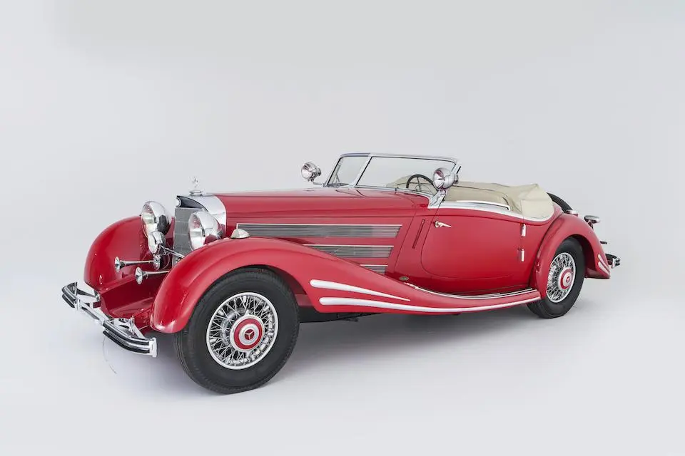 130 854 : 1936, 500 K, Roadster, moteur 130 854, rouge, capote crème, pneus flancs blancs, roues à rayons.