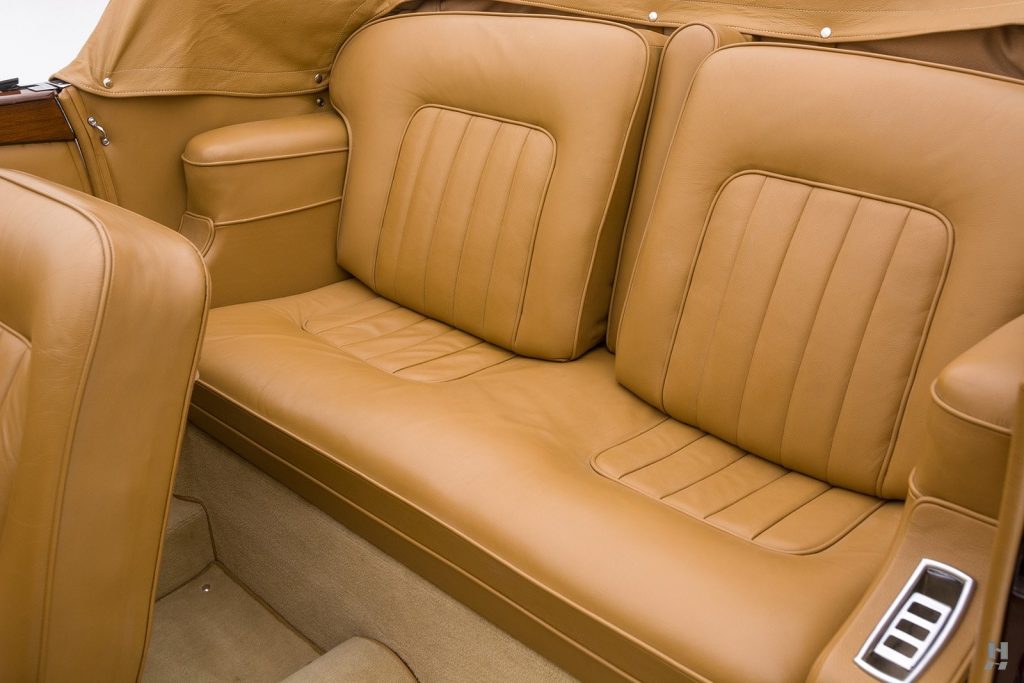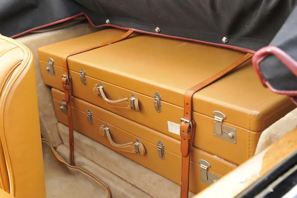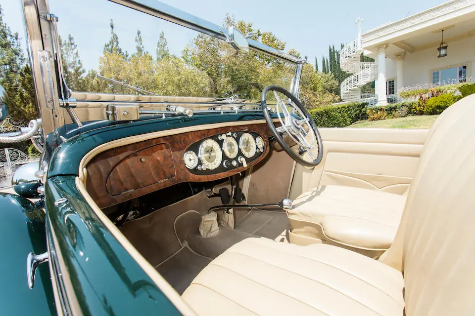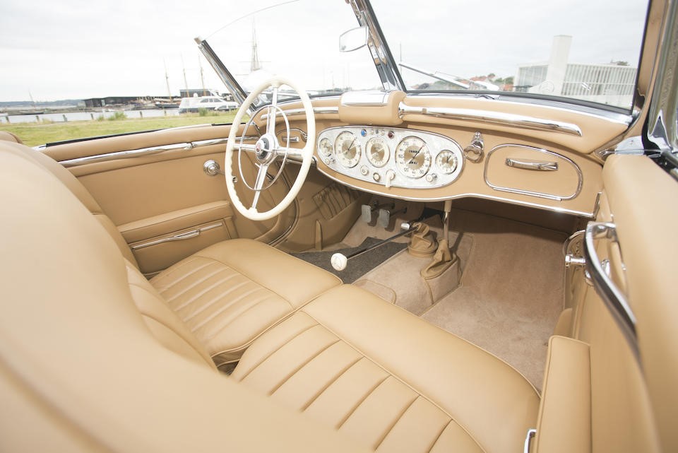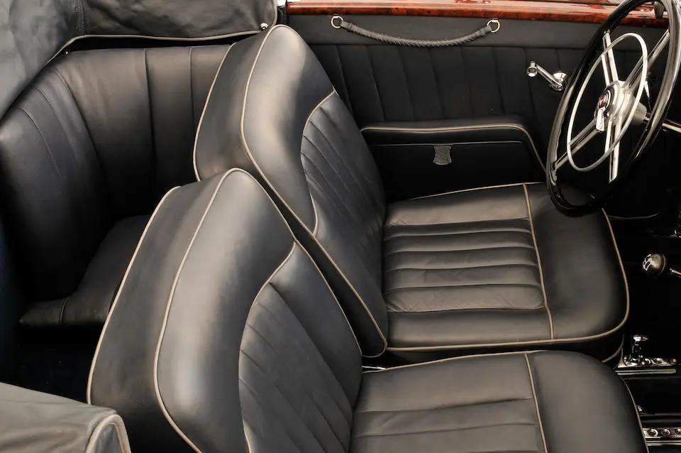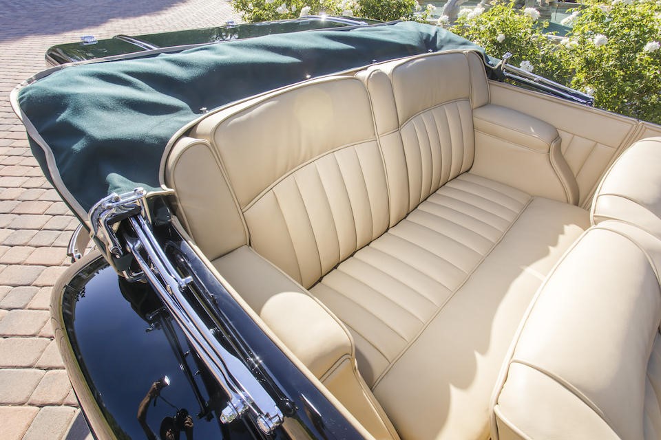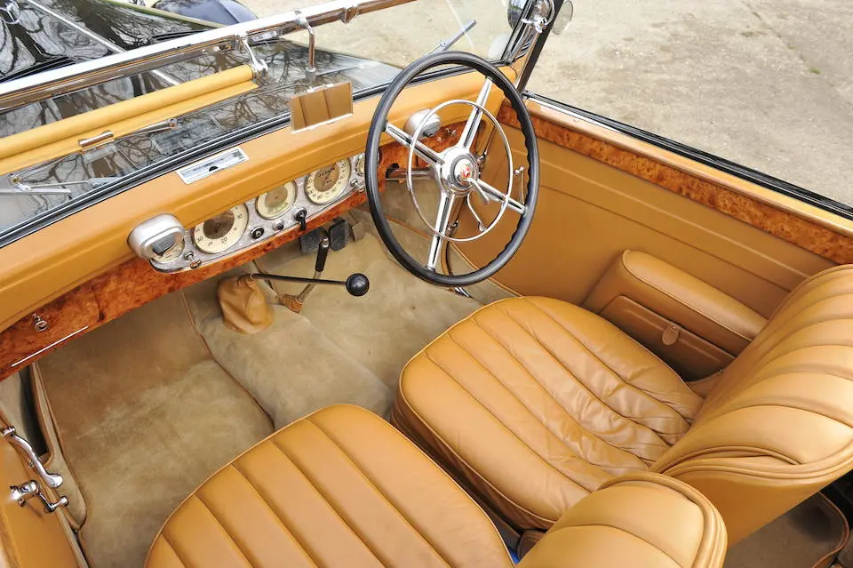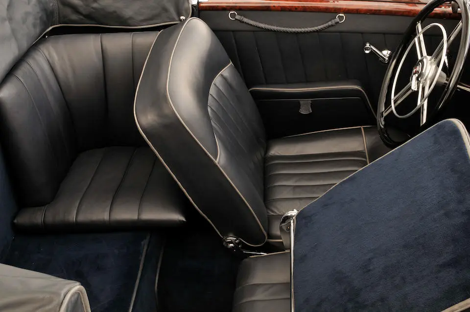 Noire, cuir beige, capote beige, jantes à rayons chromés, pneus flancs blancs Bedford Famous Coach, roues de secours sur les ailes, phares Bosch, phare additionnel au centre de la calandre Raymond Pivophare orientable commandée par le volant,