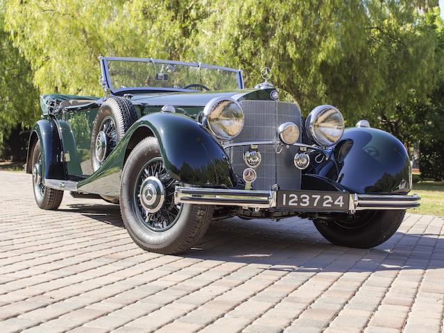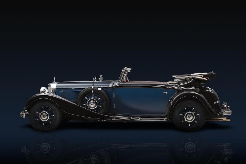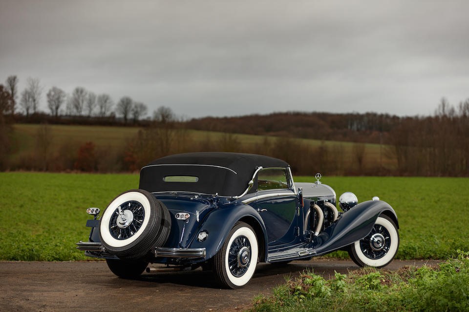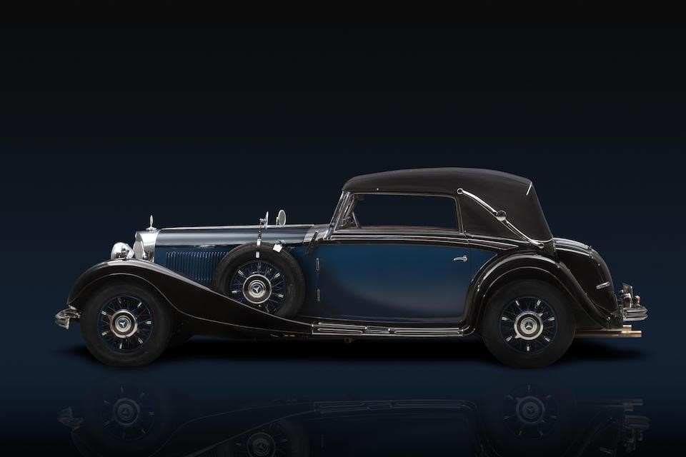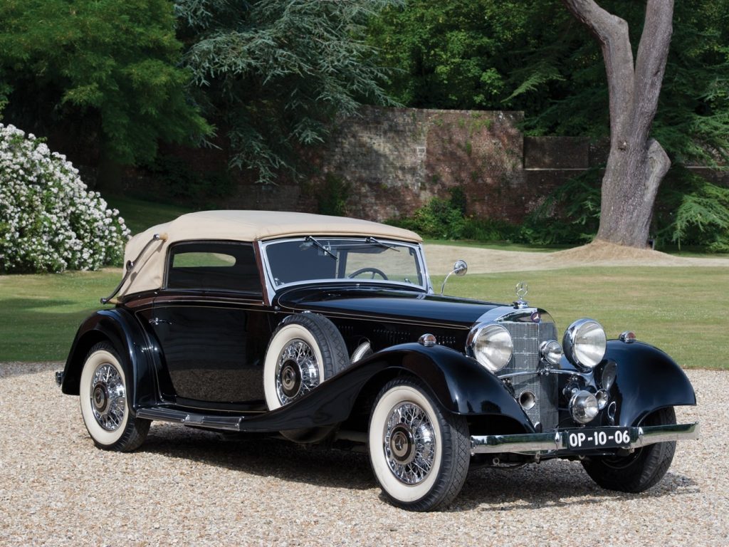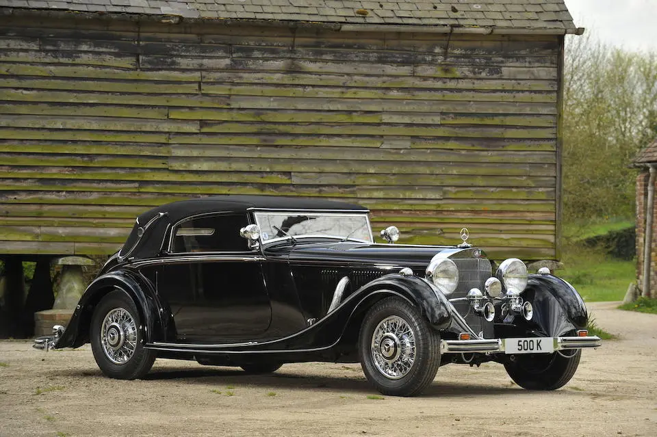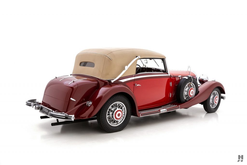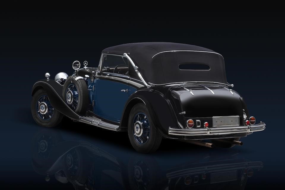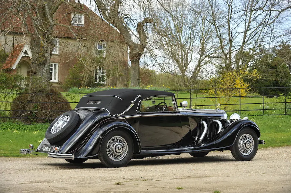 123.683 : 1935, 500 K, Cabriolet 2 places par H.J. Mulliner spats démontables, 2 roues de secours sur le coffre, espace de rangement pour bagages derrière les sièges arrières, tableau de bord noyer.