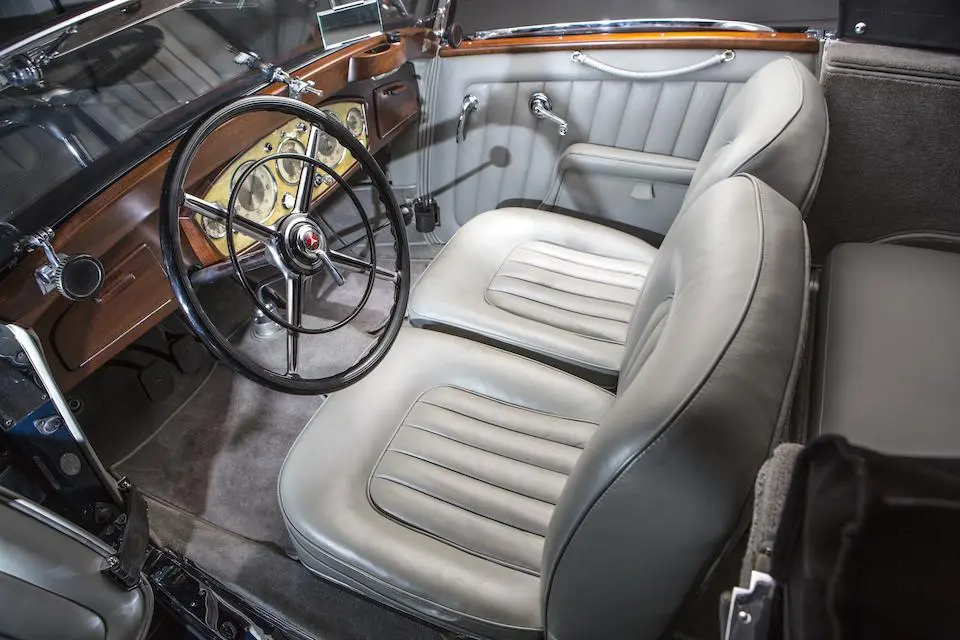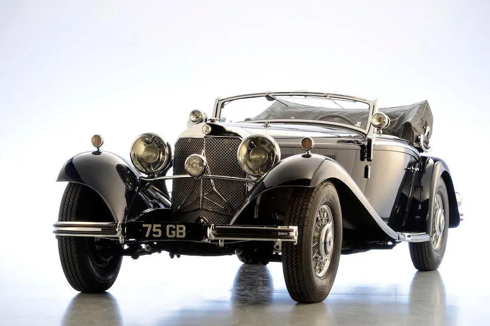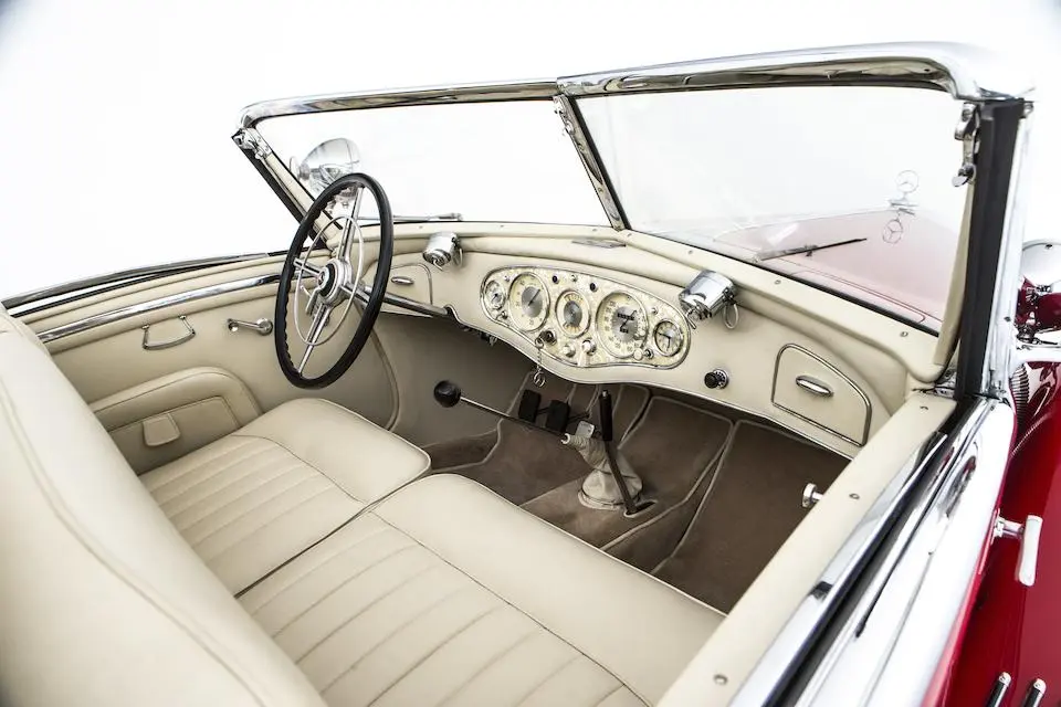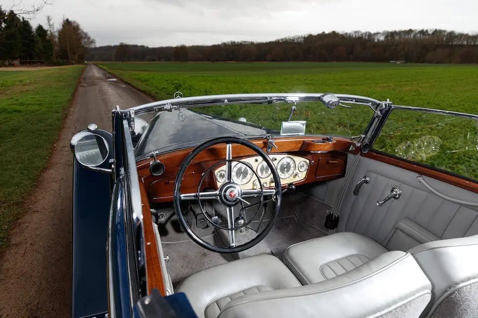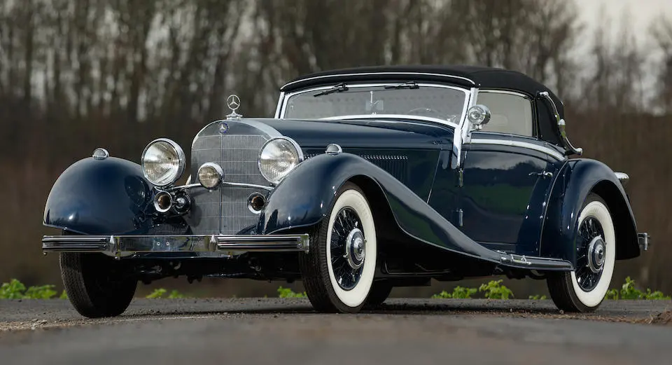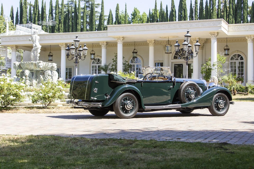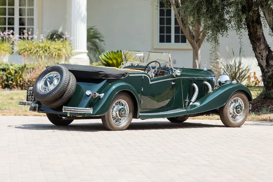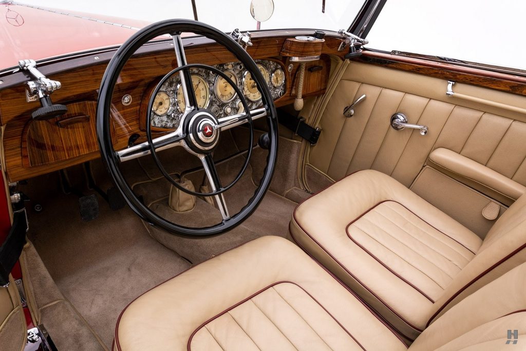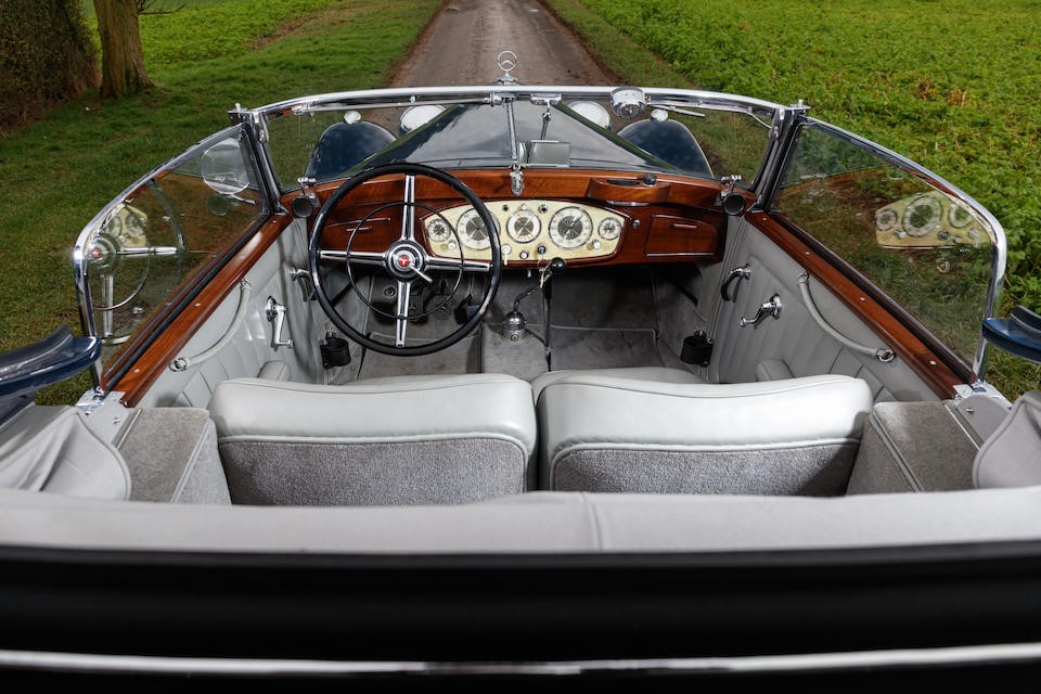 123.683 : 1935, 500 K, Cabriolet 2 places par H.J. Mulliner spats démontables, 2 roues de secours sur le coffre, espace de rangement pour bagages derrière les sièges arrières, tableau de bord noyer.