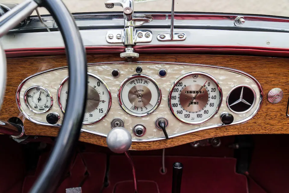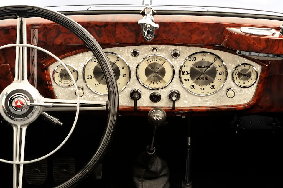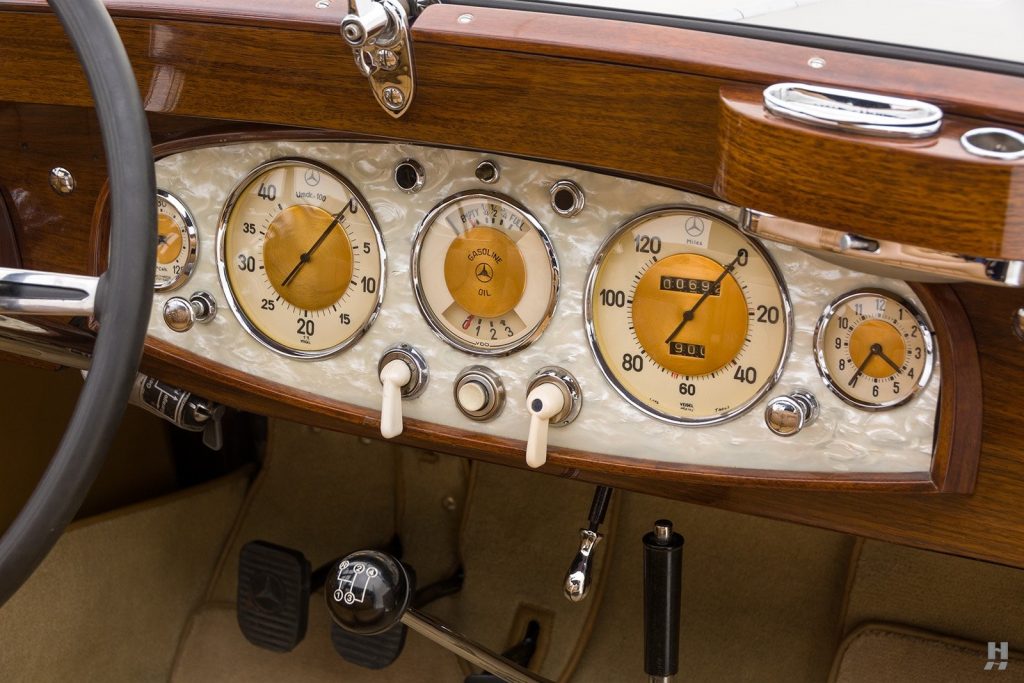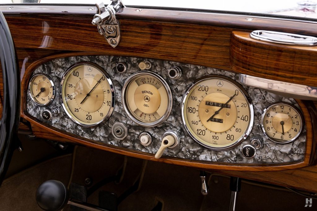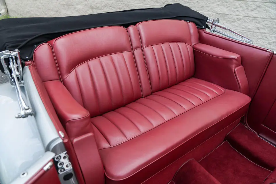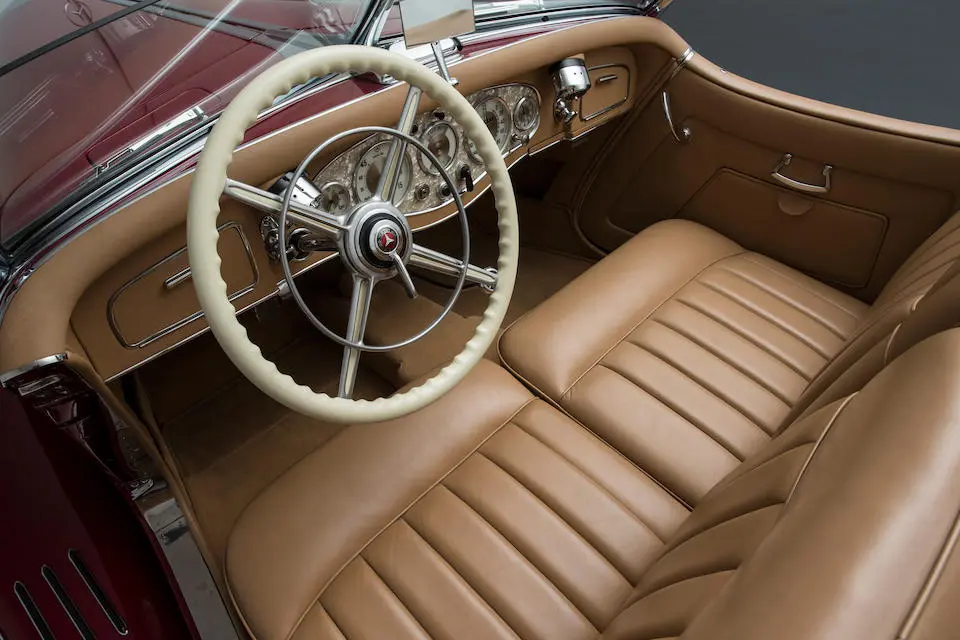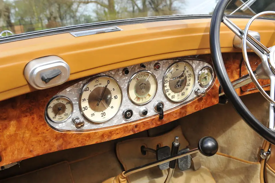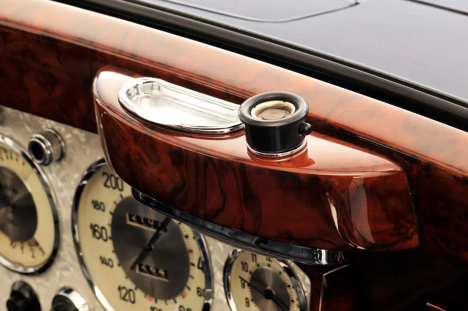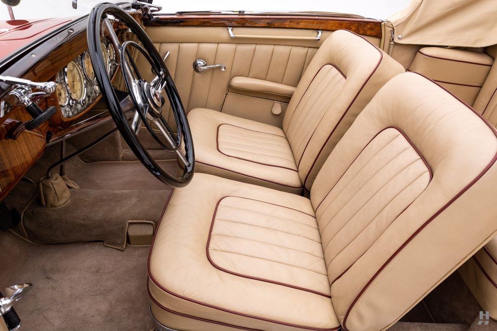 123.683 : 1935, 500 K, Cabriolet 2 places par H.J. Mulliner spats démontables, 2 roues de secours sur le coffre, espace de rangement pour bagages derrière les sièges arrières, tableau de bord noyer.